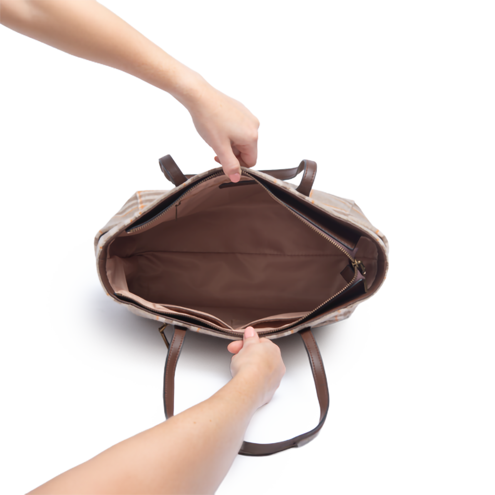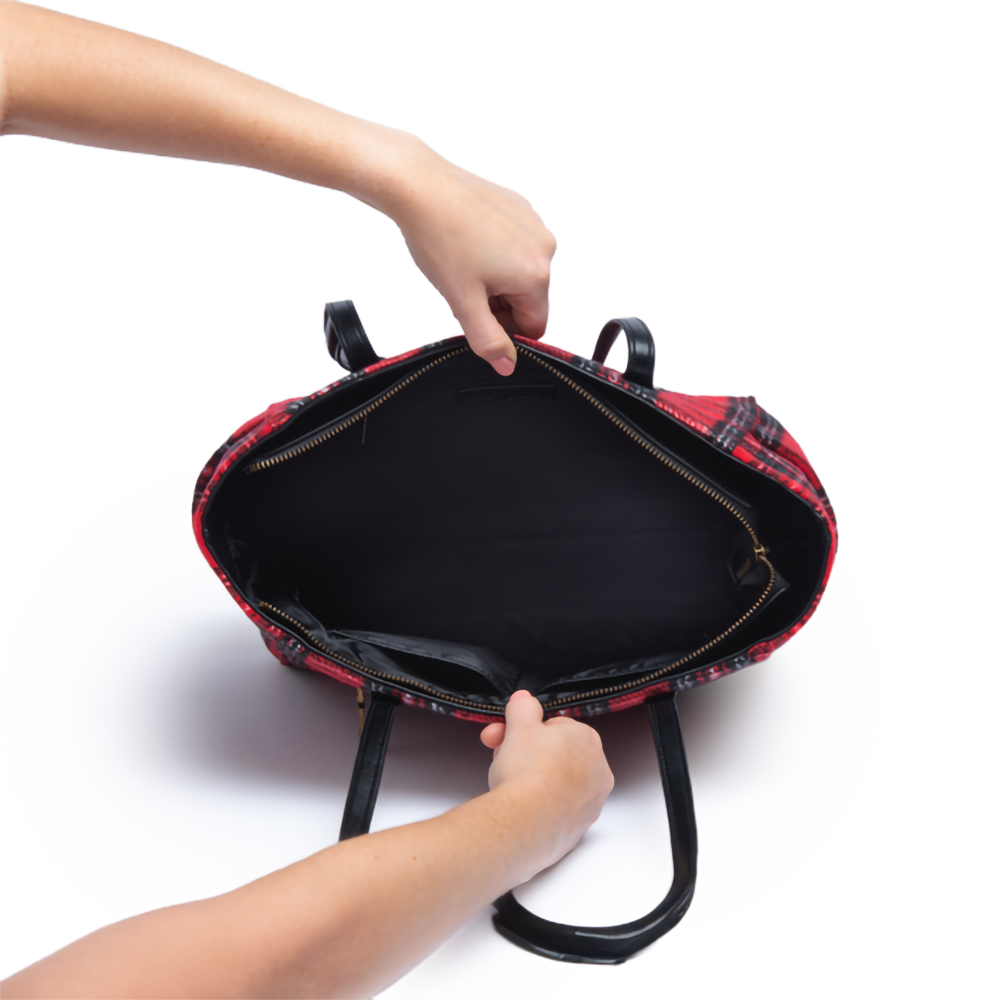 Cozy meets classic in this timeless plaid tote.. Crafted from soft plaid material with antiqued gold hardware, it’s the perfect blend of style and function. The spacious interior is thoughtfully organized with slip and zip pockets to keep your essentials in place, while exterior pockets add easy access for your phone or keys. A top zip closure keeps everything secure, and comfortable shoulder straps make it ideal for everyday wear.
