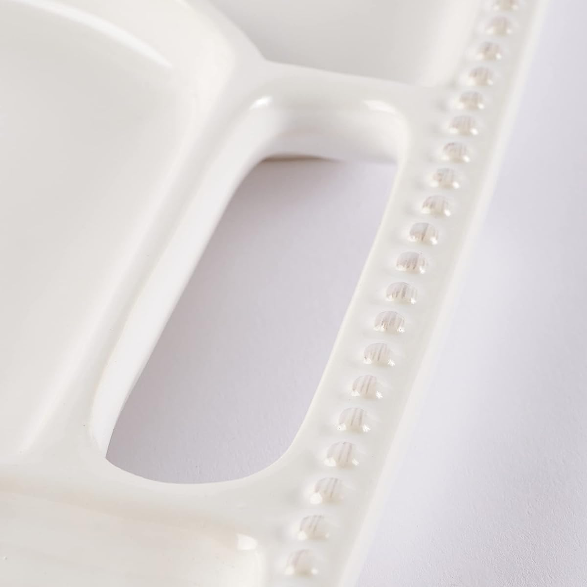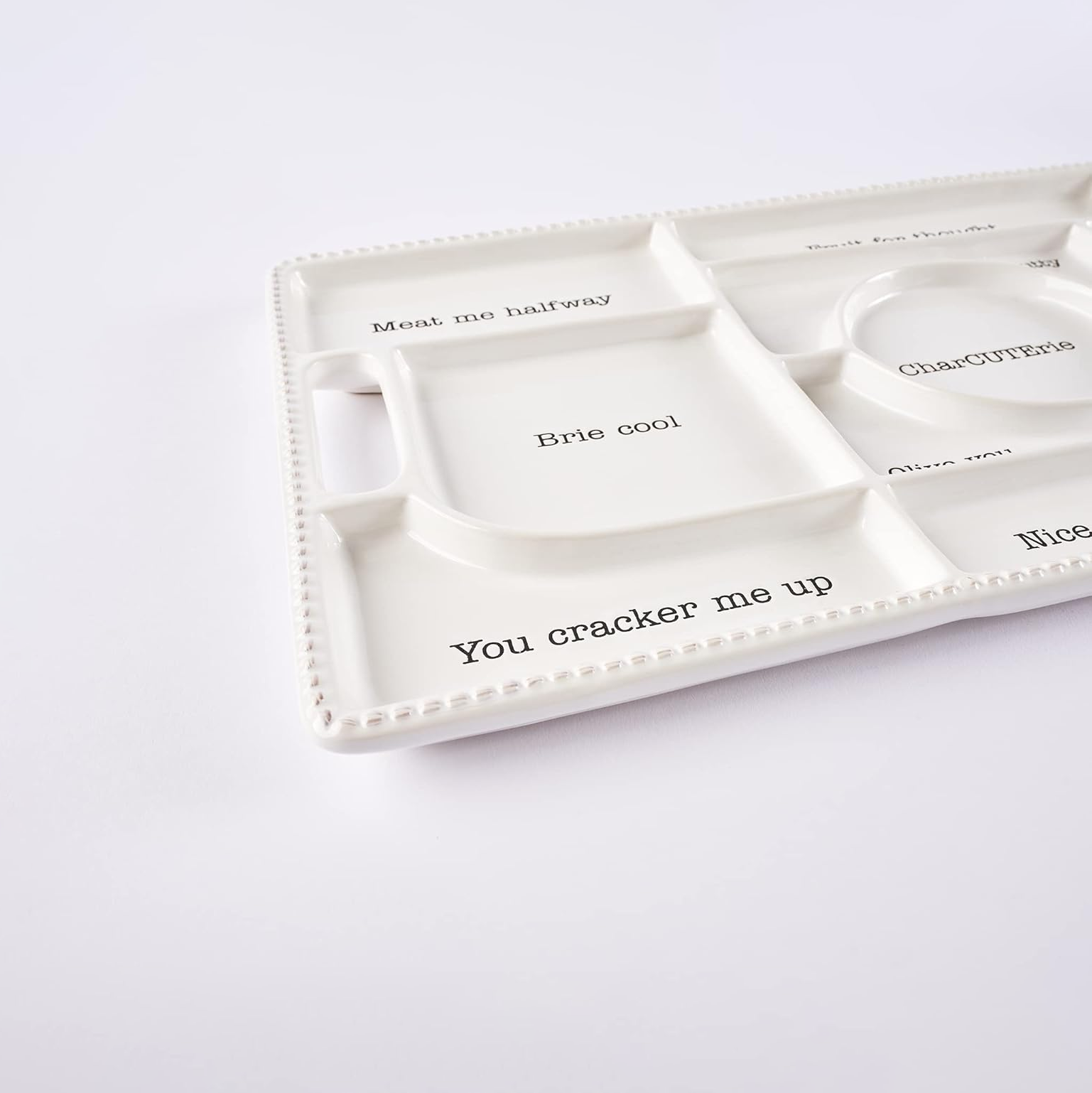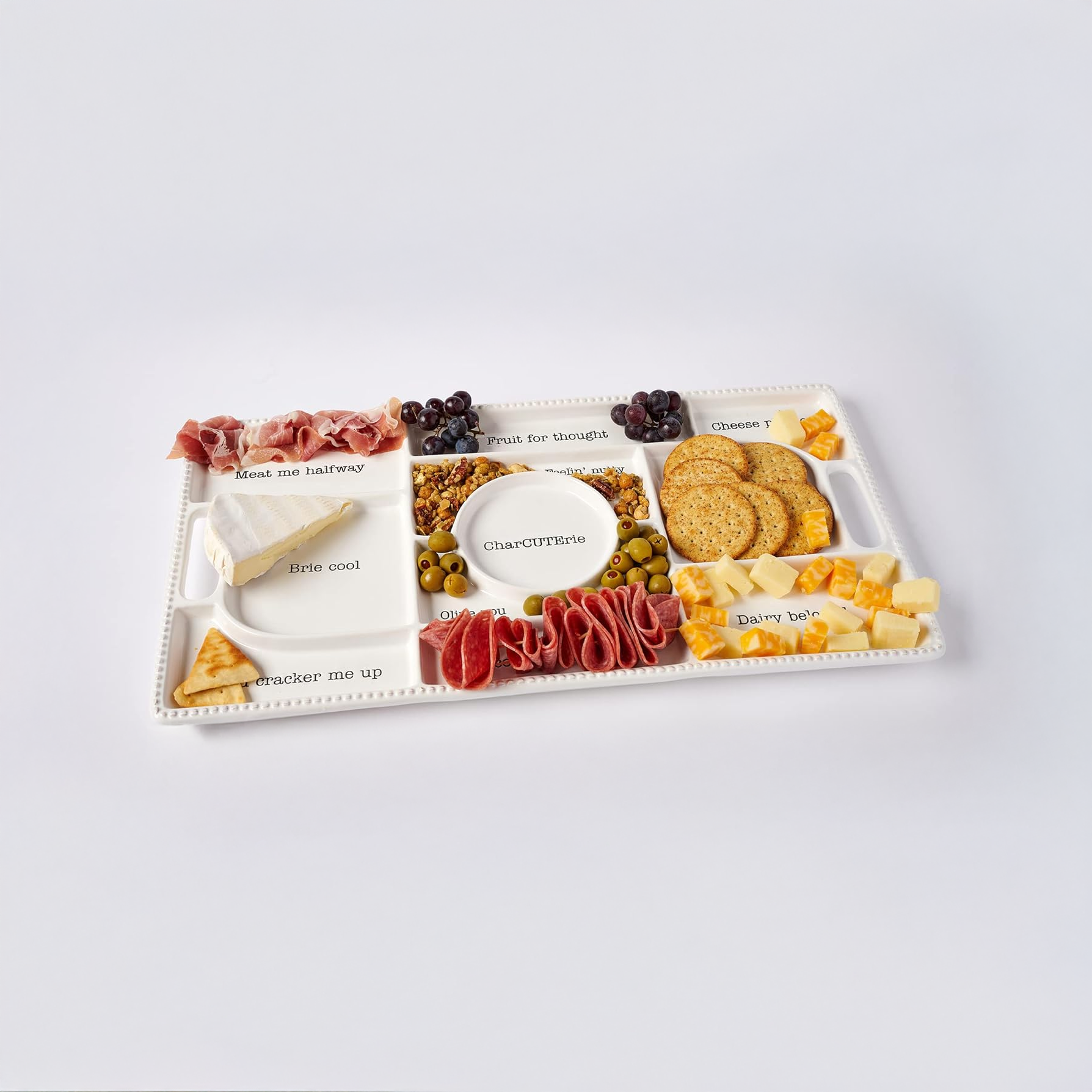 Bring fun and functionality together with this Punny Provisions Ceramic Charcuterie Board. This beaded ceramic tray, crafted from durable dolomite, makes assembling your favorite cheeses, meats, and snacks a breeze — thanks to fool-proof labeled sections like “Meet me halfway,” “Brie cool,” and “Let’s take a cracker at it.” With side handles for easy carrying and a generous size of 11 ¾" × 22", it’s perfect for everything from intimate gatherings to large get-togethers. The board is both microwave- and dishwasher-safe, but hand washing is recommended to preserve its charm and longevity.