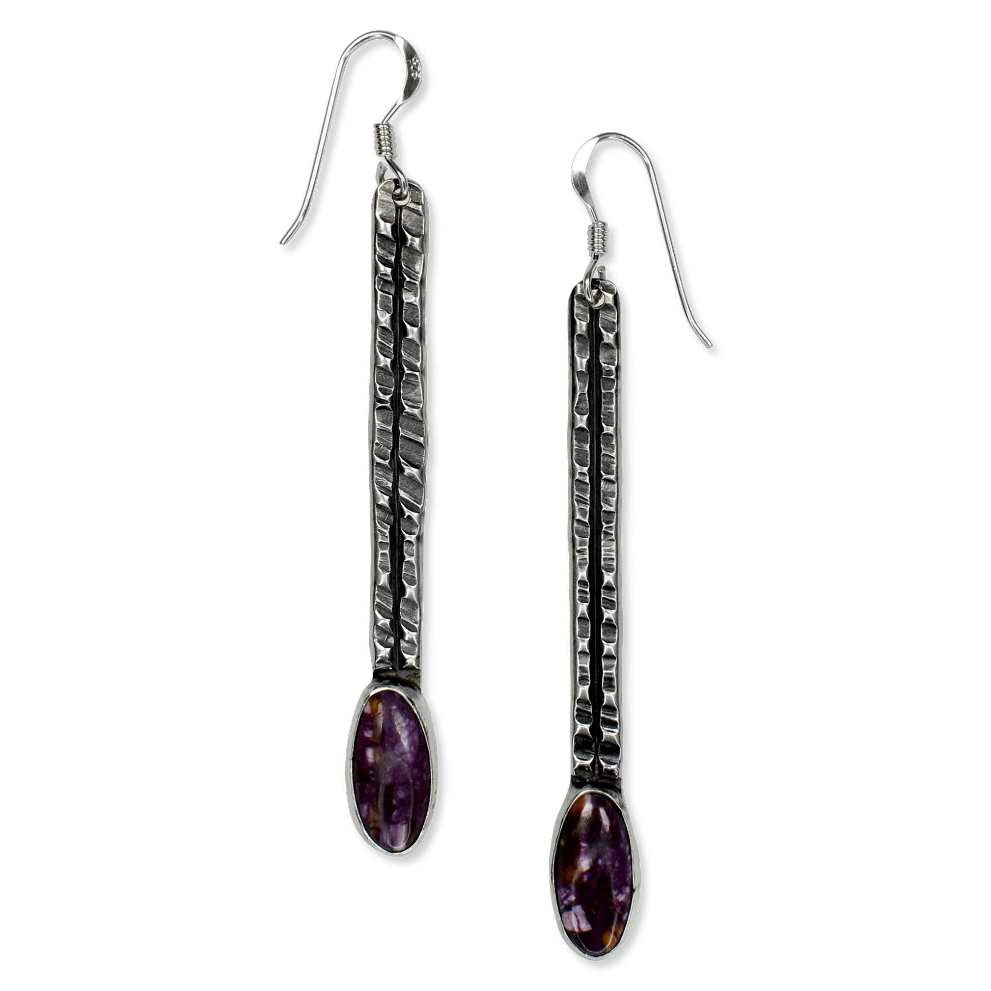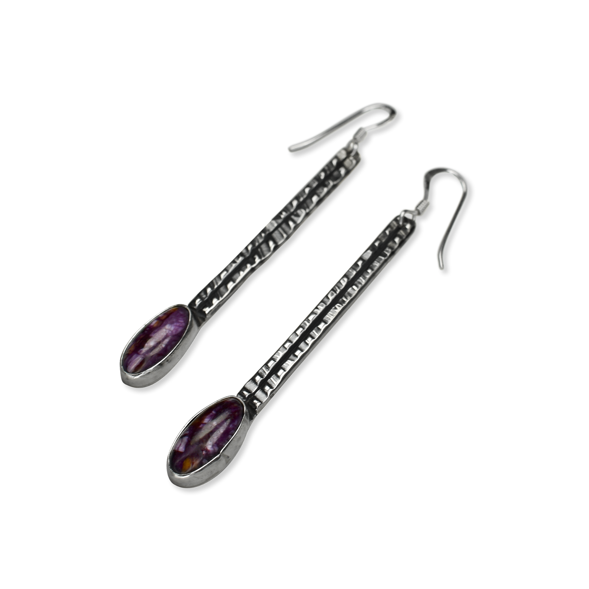 These striking Purple Spiny Oyster Raindrop Earrings feature long, textured sterling silver drops with a hammered finish that catches the light beautifully. At the base of each earring, a deep purple spiny oyster cabochon adds a pop of natural color and warmth. The elegant oval stones are hand-set in simple bezels, allowing the rich hues and organic marbling to shine through.