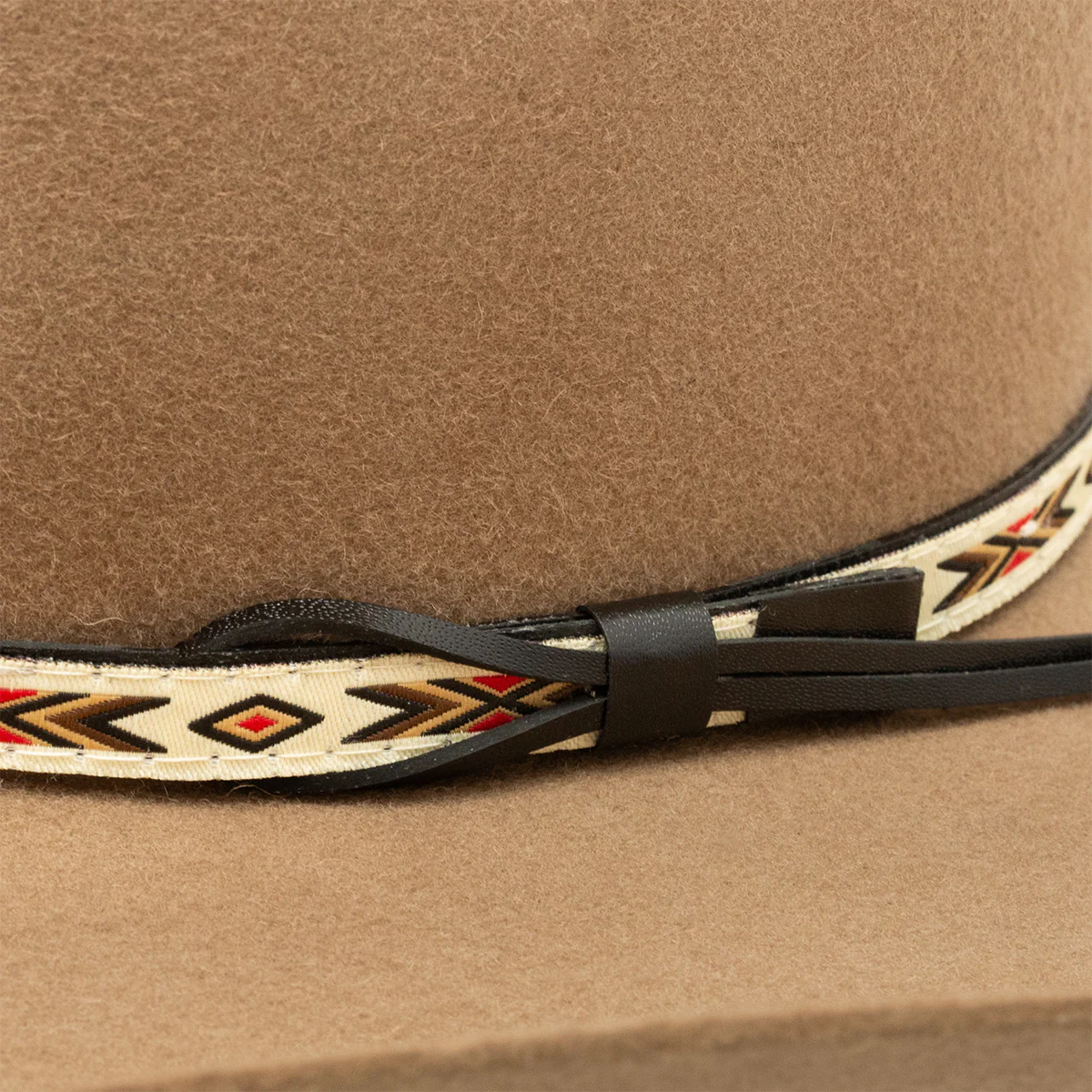 A hat designed for those who live with a champion's spirit, The Tempe from the Tuff Hedeman Collection is a study in contrasts. This isn't just a hat; it's a testament to heritage and uncompromising style. Crafted with a sharp 4 3/4" Minnick Crown and a 4 1/2" brim, its striking Pecan color is built to stand out. Inside, a premium leather sweatband provides superior comfort and a long-lasting fit that only gets better with time. Its hatband pairs rugged leather with a strip of patterned cloth, creating a look that is both strong and refined. This hat is a reflection of the bull riding legend himself.