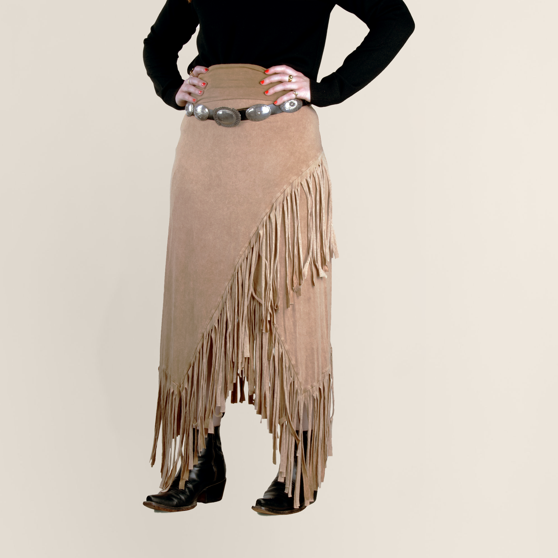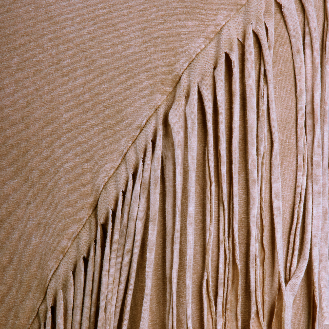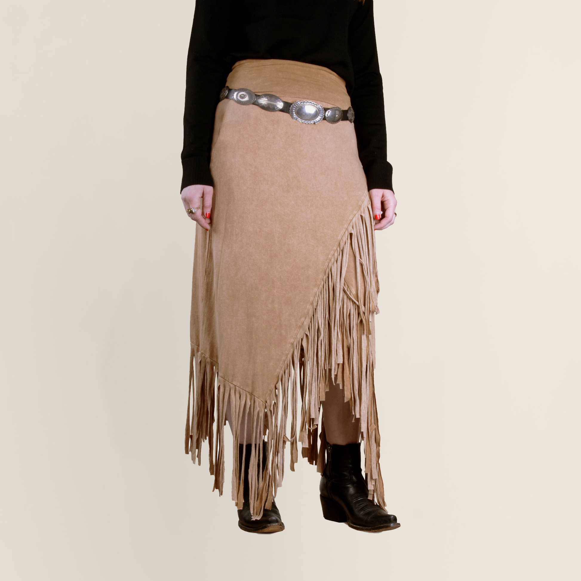 Designed for effortless chic and crafted from camel-colored jersey knit material, this skirt features an asymmetrical ankle-length hemline with fringe detail. Pull it up and wear it as a dress for a versatile day-to-evening look.