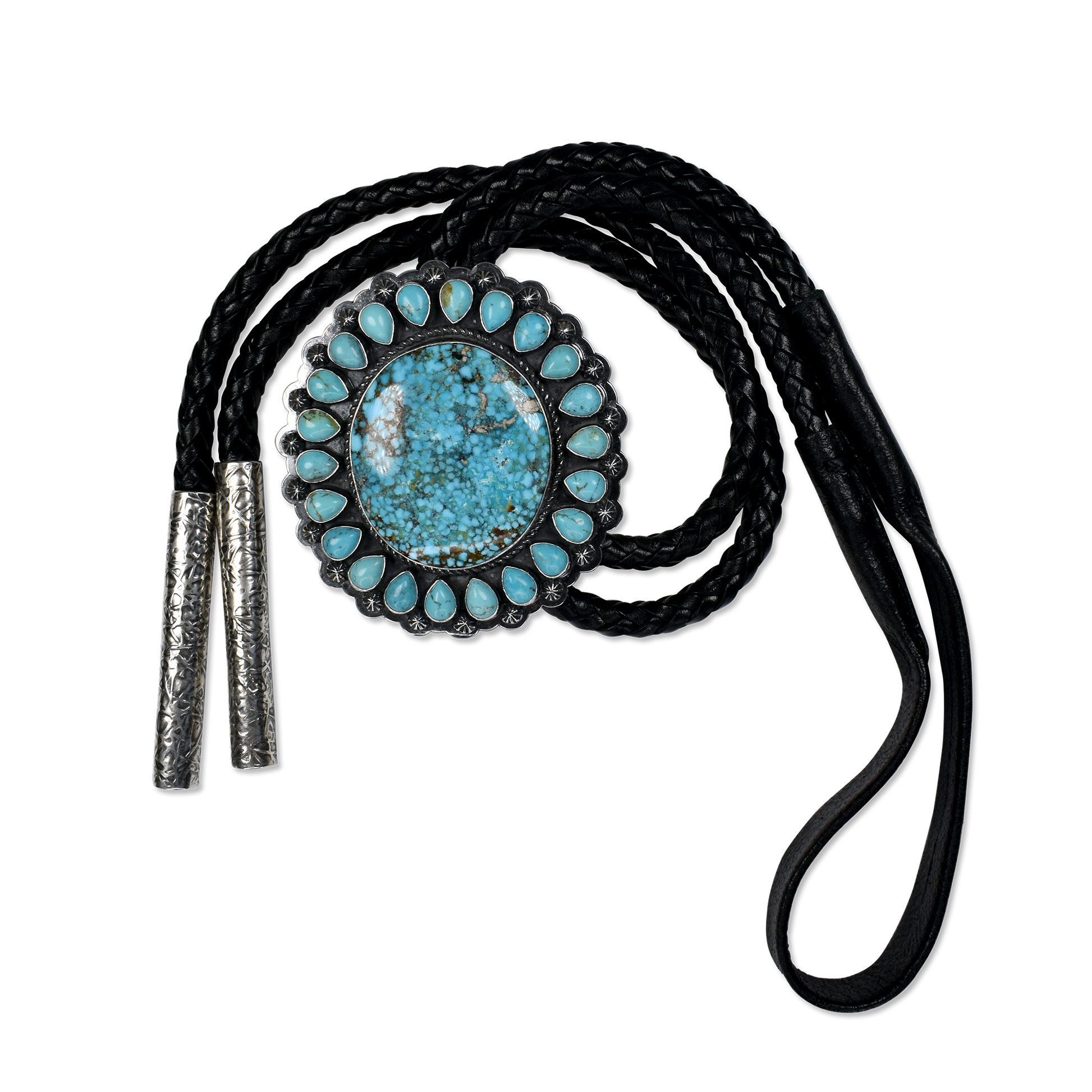 The Round Kingman Turquoise Bolo with Teardrop Accent Stones by Travis Teller is a breathtaking piece of Southwestern craftsmanship, blending traditional Navajo design with the natural beauty of Kingman Turquoise. This bolo features a large, round centerpiece stone showcasing Kingman’s signature vivid blue hues and intricate matrix patterns, surrounded by teardrop-shaped turquoise accents meticulously set in sterling silver. The handcrafted beaded and star-stamped silverwork enhances the bolo’s visual appeal, creating a striking sunburst effect. The piece is completed with a braided black leather cord and engraved sterling silver tips, offering a perfect balance of elegance and rugged Western style.