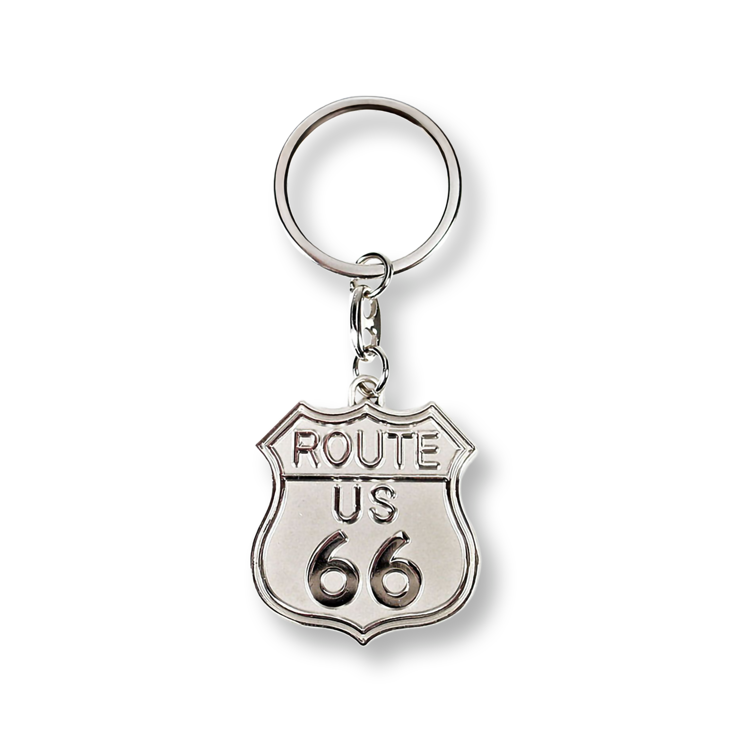 Carry the iconic Route 66 shield wherever you go with this classic metal keychain. The cast silver-finish shield charm measures 1 5/8" high × 1 1/2" wide, featuring a bold front design and a textured metal back for a timeless look.