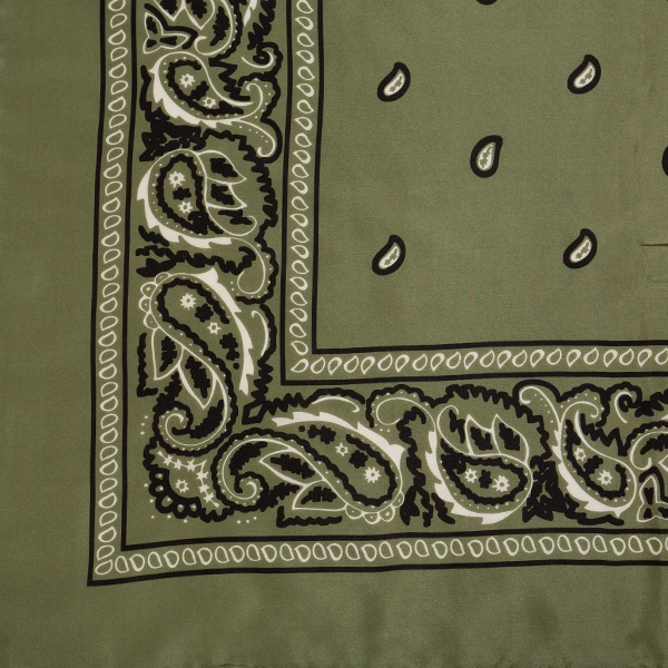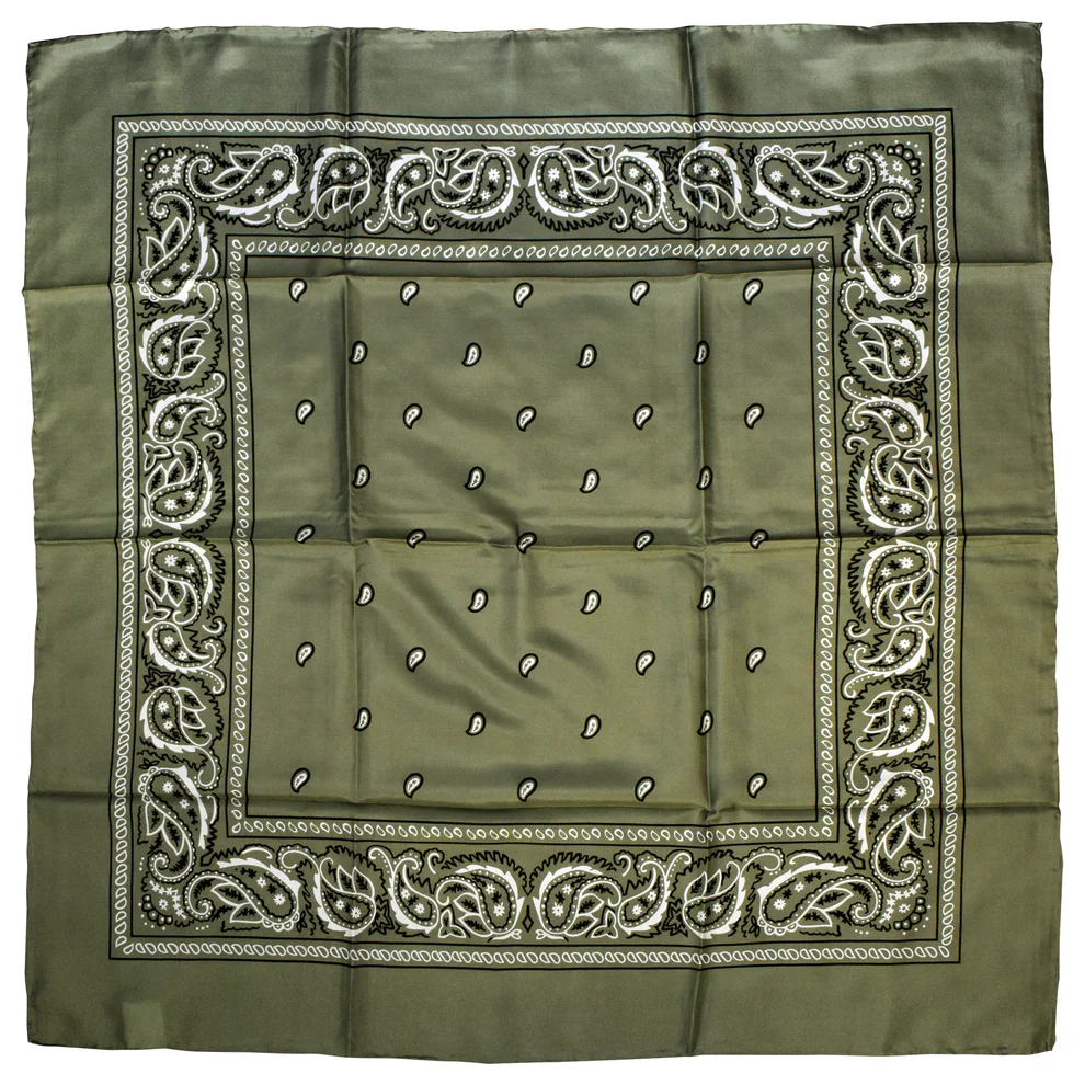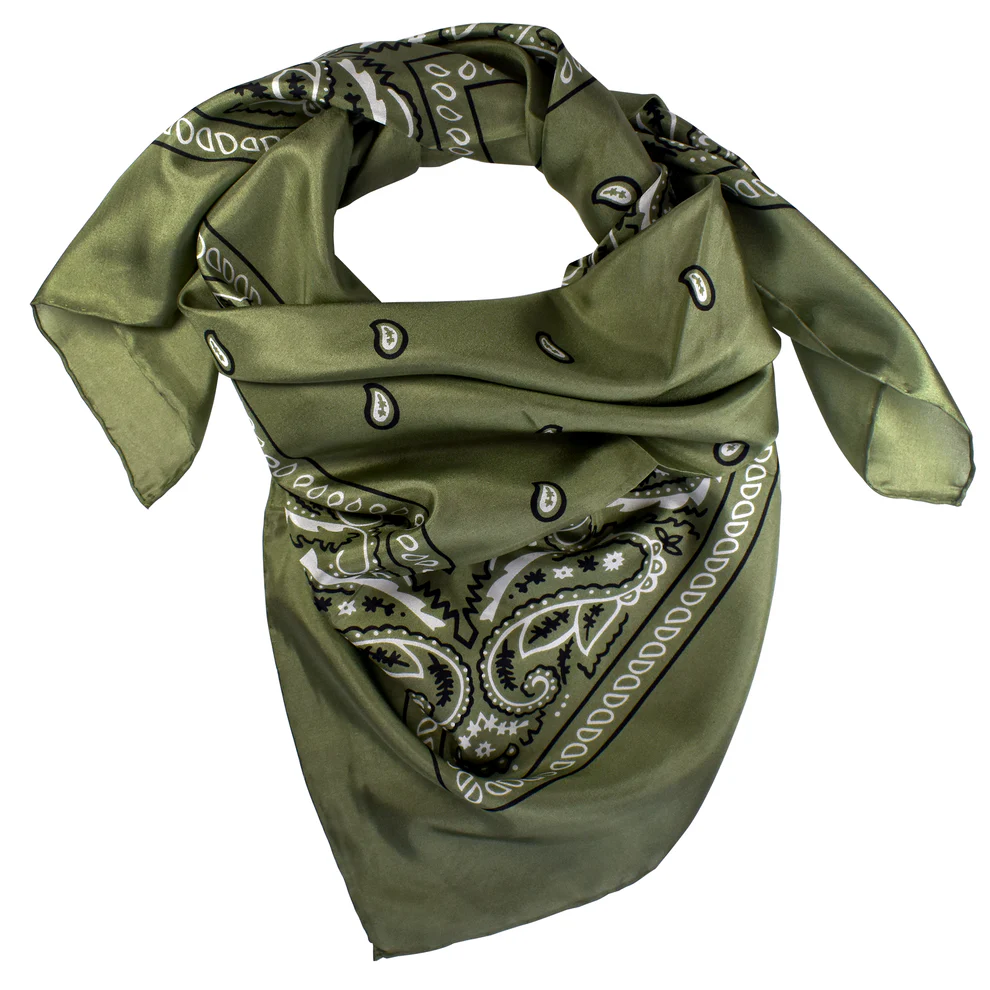 Featuring a beautiful sage green color, this bandana-style scarf showcases a traditional bandana print that exudes charm and versatility. The soft silk drapes effortlessly, making it ideal for wearing around your neck, tying in your hair, or even as a chic accent on your handbag.
