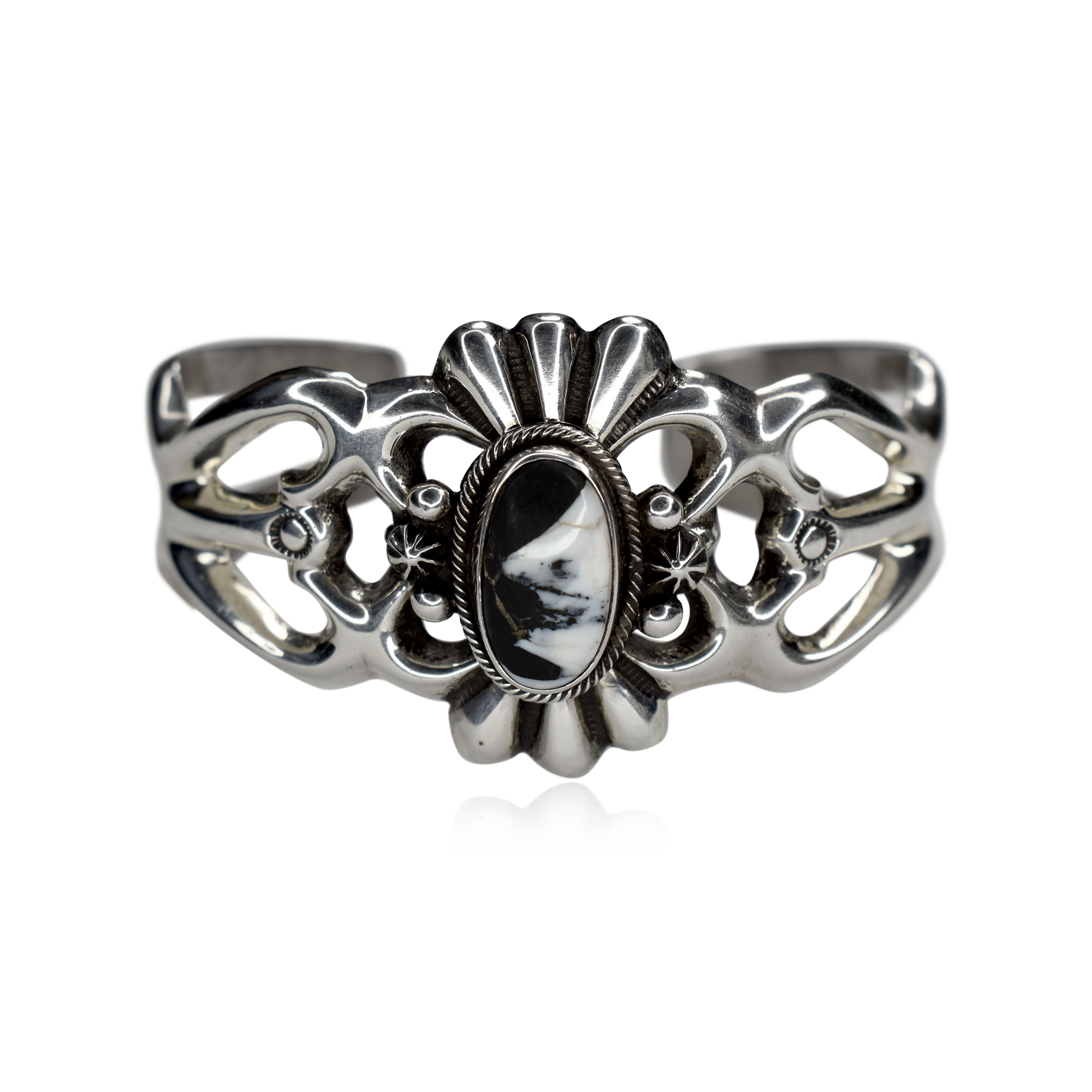 Bold, refined, and rooted in tradition, the Shadowline Cuff by acclaimed Navajo silversmith Harrison Bitsui showcases the striking beauty of White Buffalo stone in a masterfully handcrafted sterling silver setting. The central oval stone features dramatic black and white marbling, a natural hallmark of White Buffalo, symbolizing balance and contrast in the natural world.