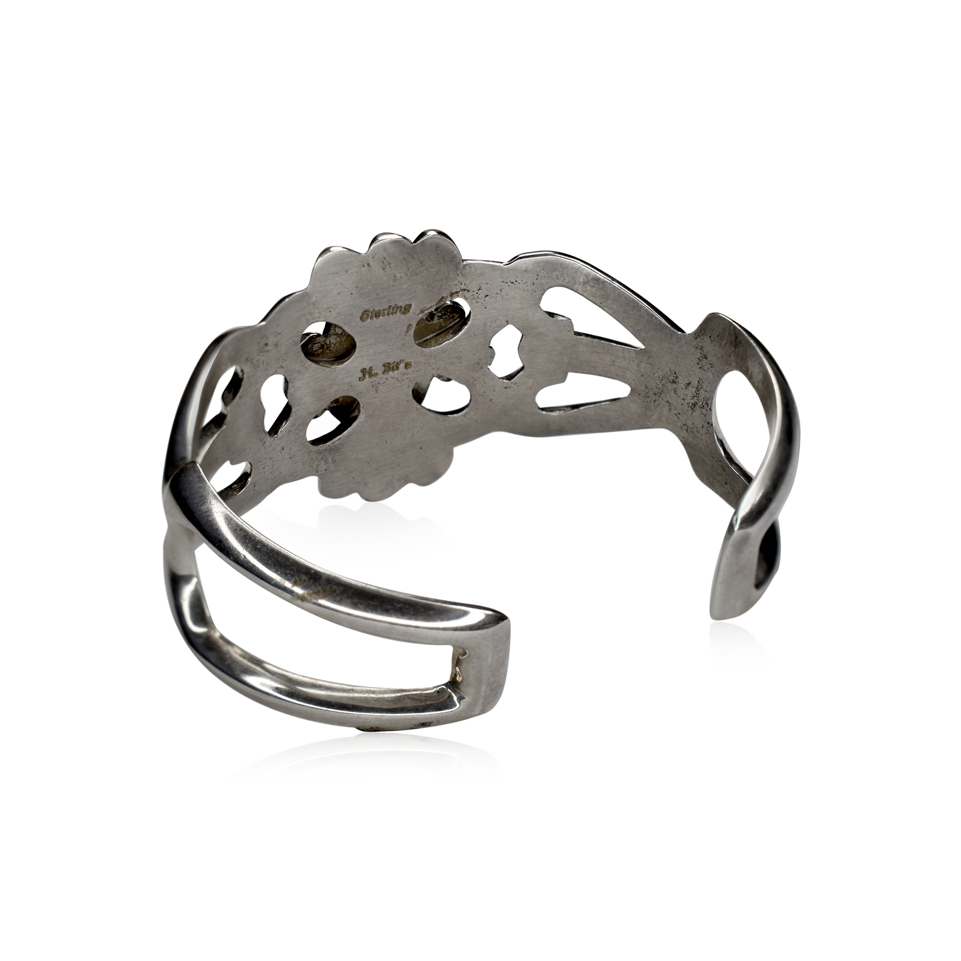 Encased in a detailed bezel with rope-like edging, the stone is framed by ornate silverwork that blends floral and geometric motifs, each element meticulously stamped and shaped to reflect Bitsui’s signature style. Measuring 2 ½" across, 1 ¼" high, with a 1" opening and 2" front to back, this cuff offers a substantial yet elegant presence on the wrist. Hallmarked “H. Bit’s” and “Sterling,” it stands as a testament to authentic craftsmanship and timeless design.
