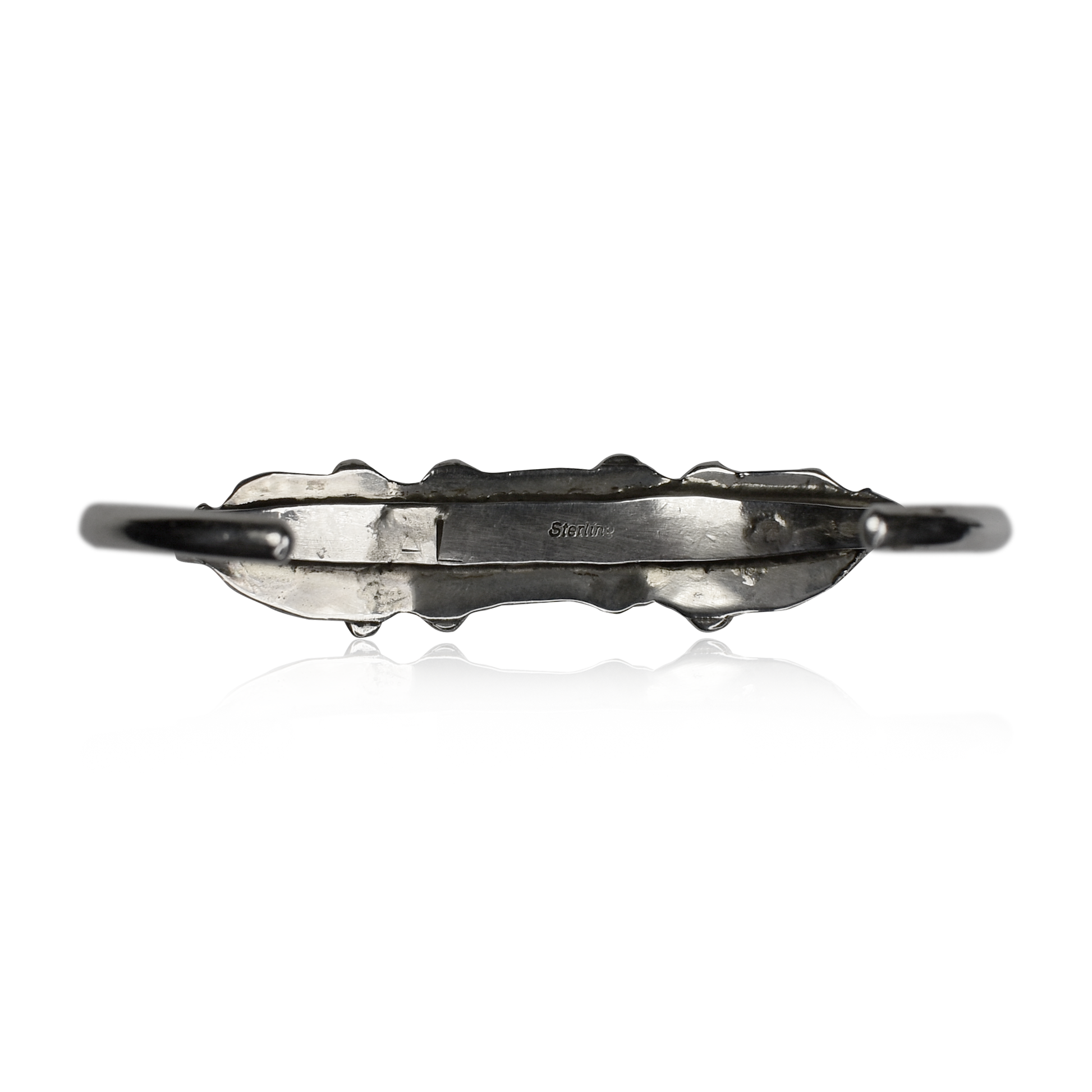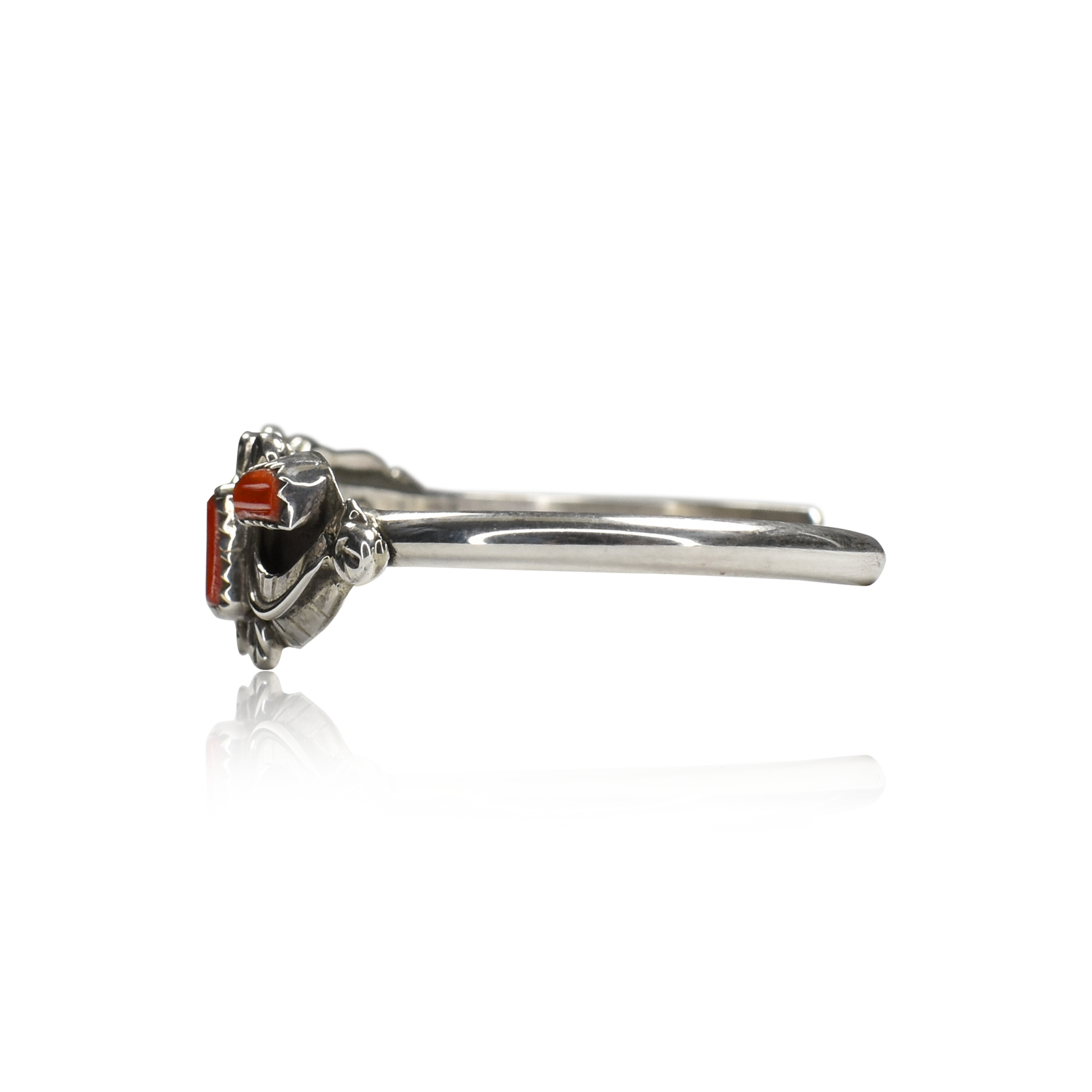 This cuff features a statement-making combination of hand-tooled and stamped silver overlay, an intricate leaf design, bright red coral baguettes, and textured bezeling for an eye-catching finish. Crafted with careful attention to detail, this cuff will elevate any outfit.