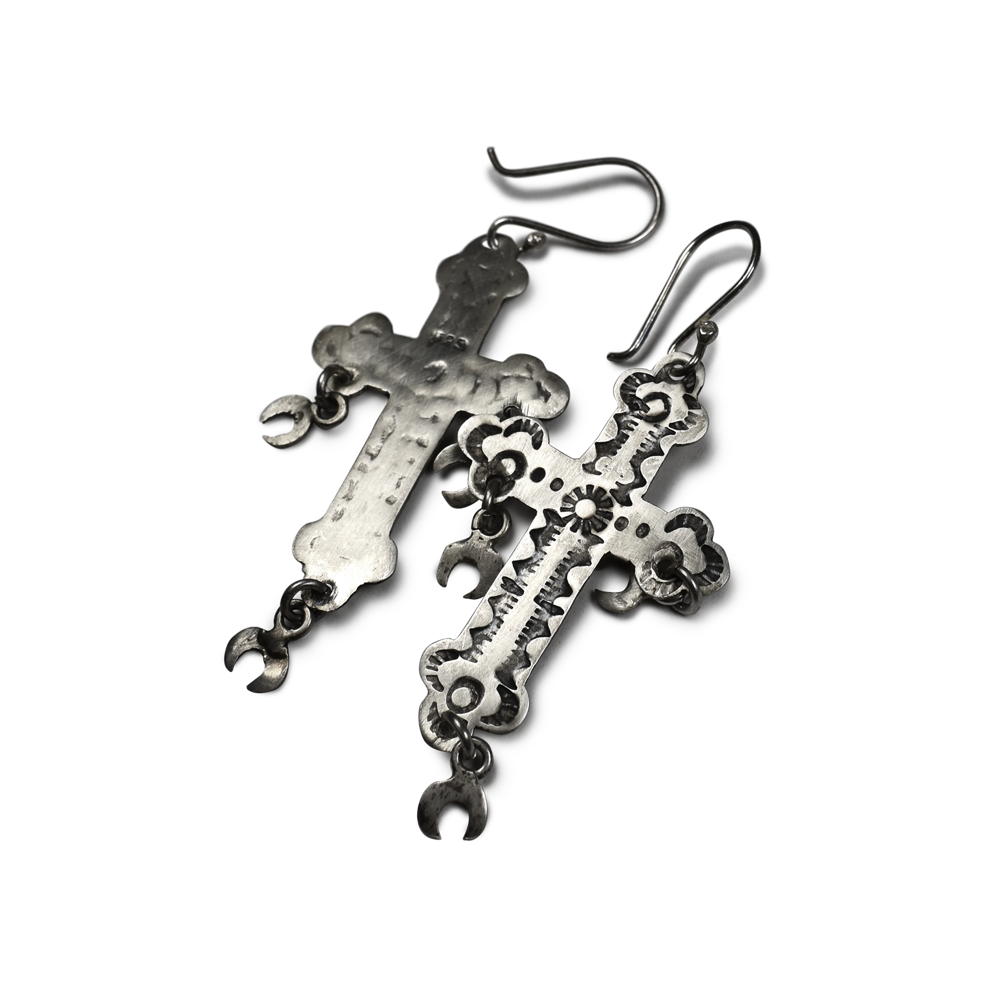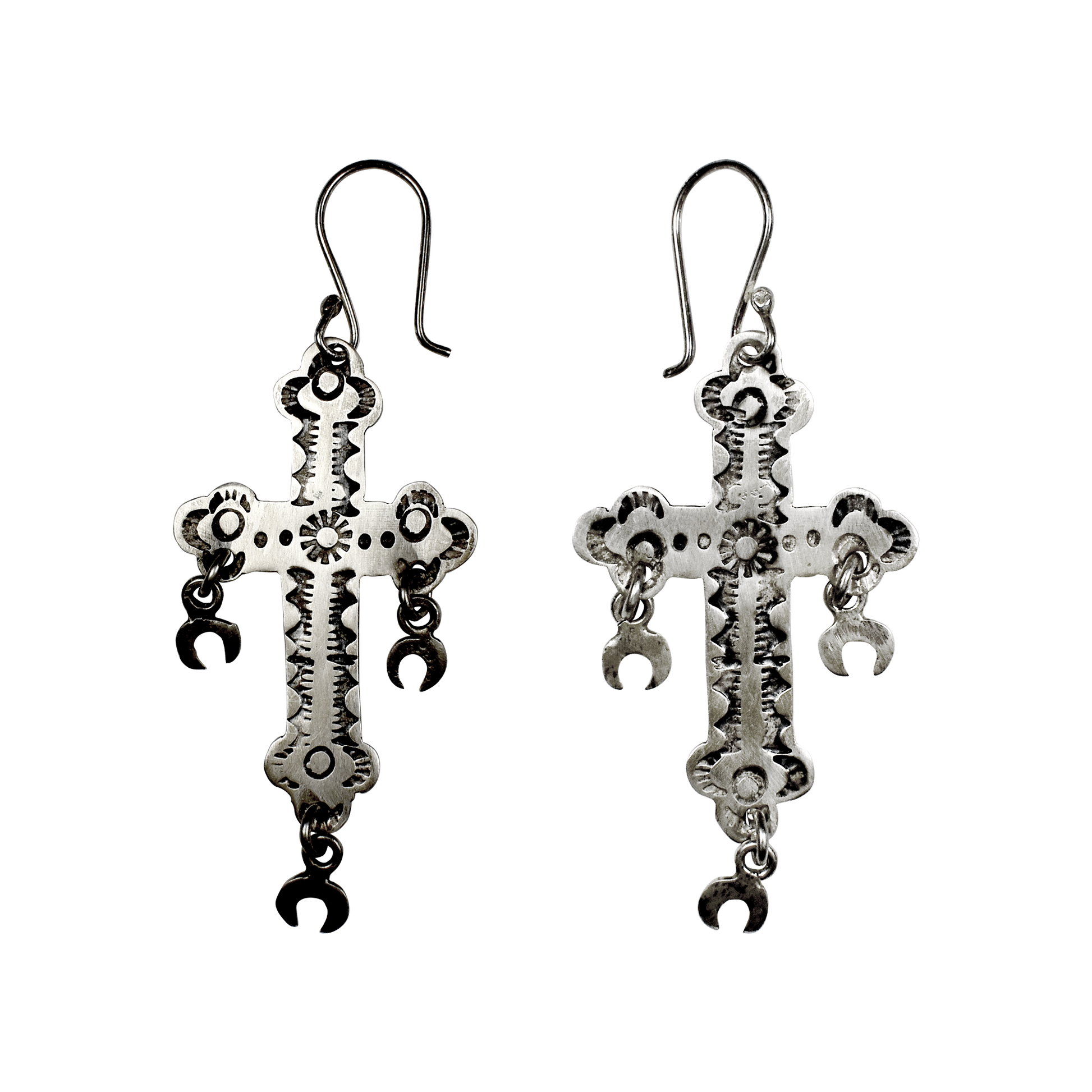 Bold symbolism meets masterful silversmithing in these Stamped Cross Crescent Moon Earrings by Rocki Gorman. Crafted in solid sterling silver and marked .925 on the reverse, each earring features a budded cross form, hand-stamped and hammered flat, with darkened patina settled into the relief to bring out every detail. Three dangling crescent moon charms adorn each cross, adding movement, balance, and layered meaning to the design.