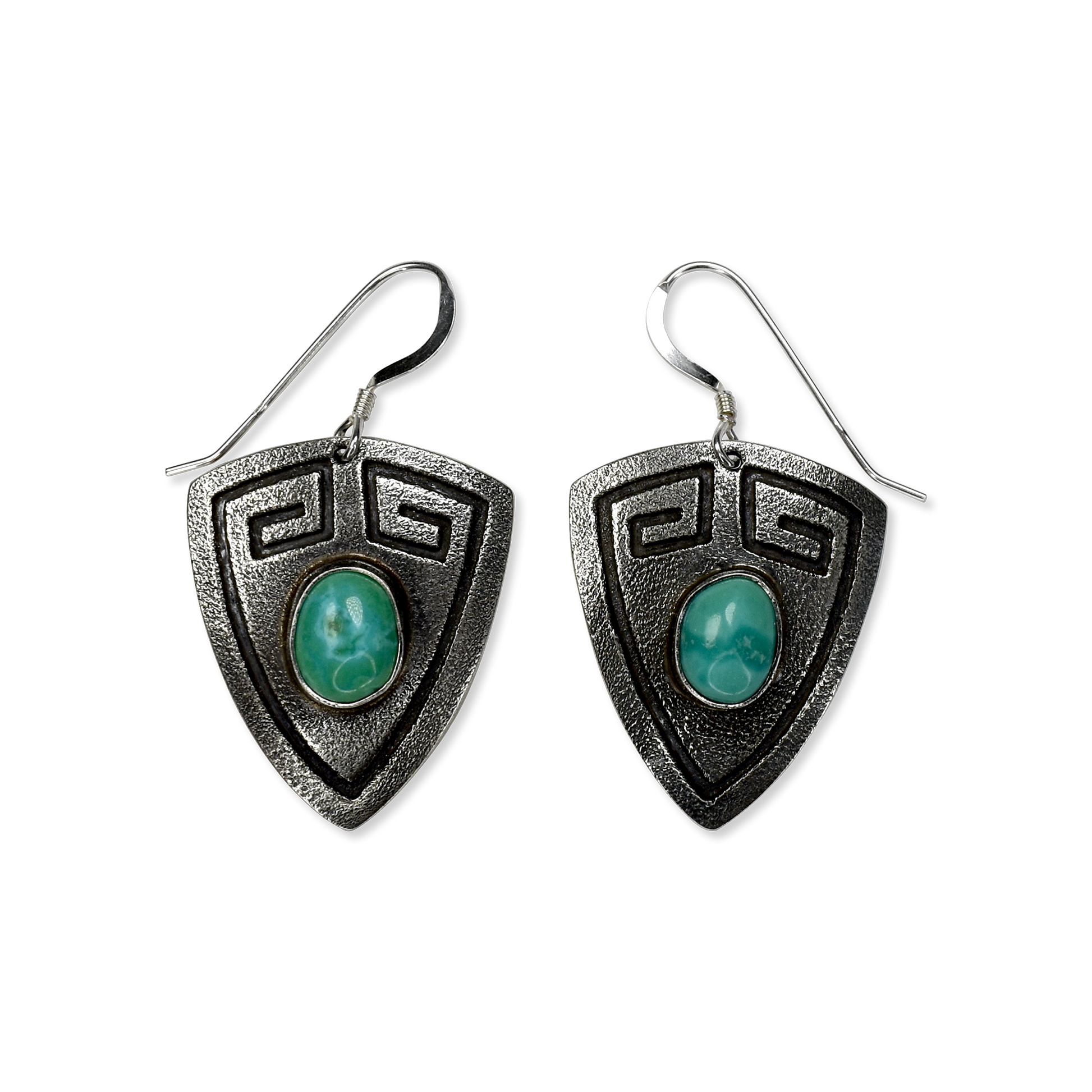 Crafted with timeless artistry and tradition, these Stamped Shield Earrings by Teller Indian Jewelry are a striking tribute to Native design and silversmithing heritage. Each earring features a bold shield-shaped sterling silver pendant, hand-stamped with a traditional geometric motif. At the center, an oval turquoise cabochon glows with vivid green-blue tones and characteristic matrixing, likely sourced from the renowned Kingman mine in Arizona, known for its range of brilliant colors and natural webbing.