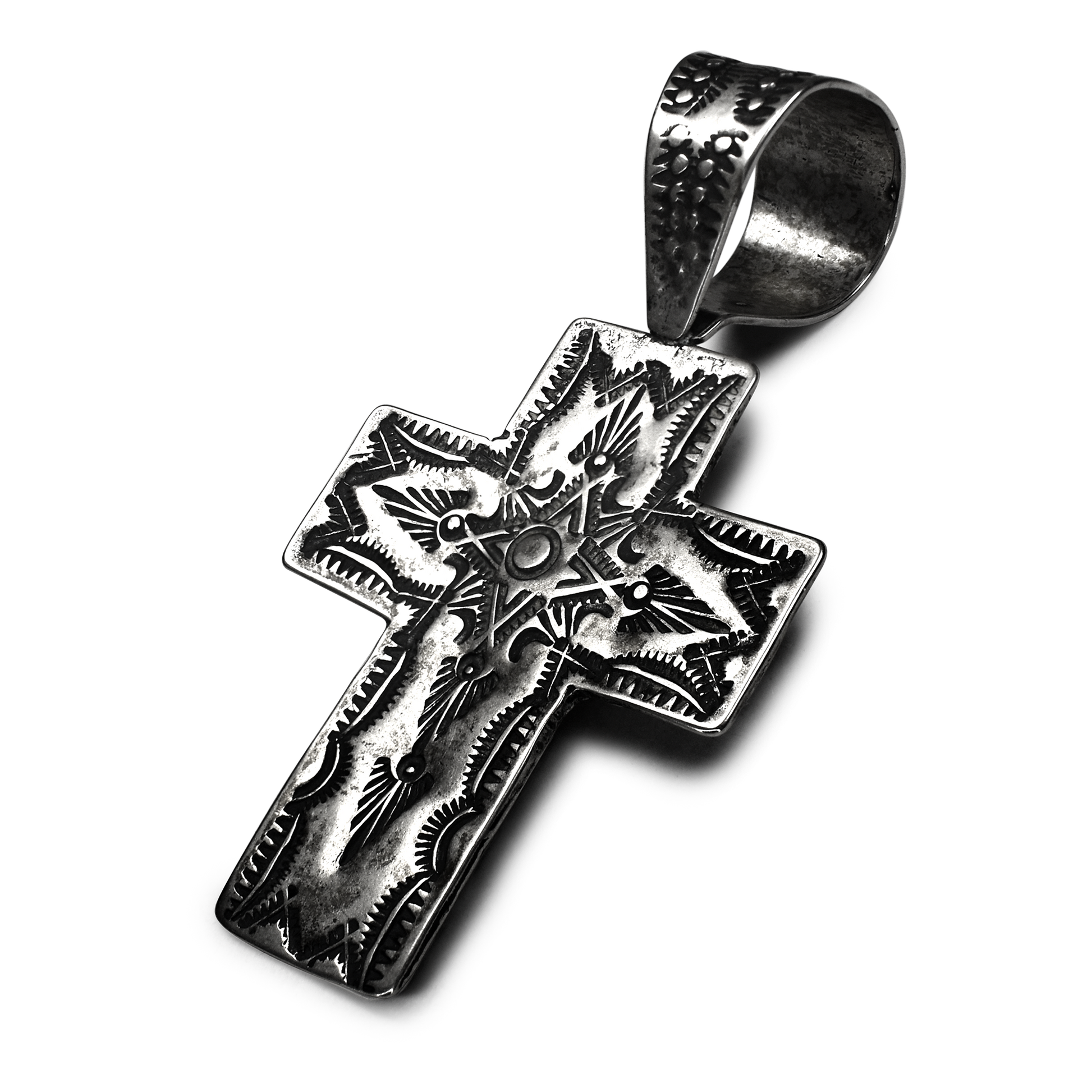 An oxidized finish settles into every stamp mark, emphasizing contrast and giving the piece a timeworn Western character. The wide, patterned bail mirrors the detailing on the cross, allowing it to hang securely on a chain or leather cord while maintaining a balanced, substantial look.