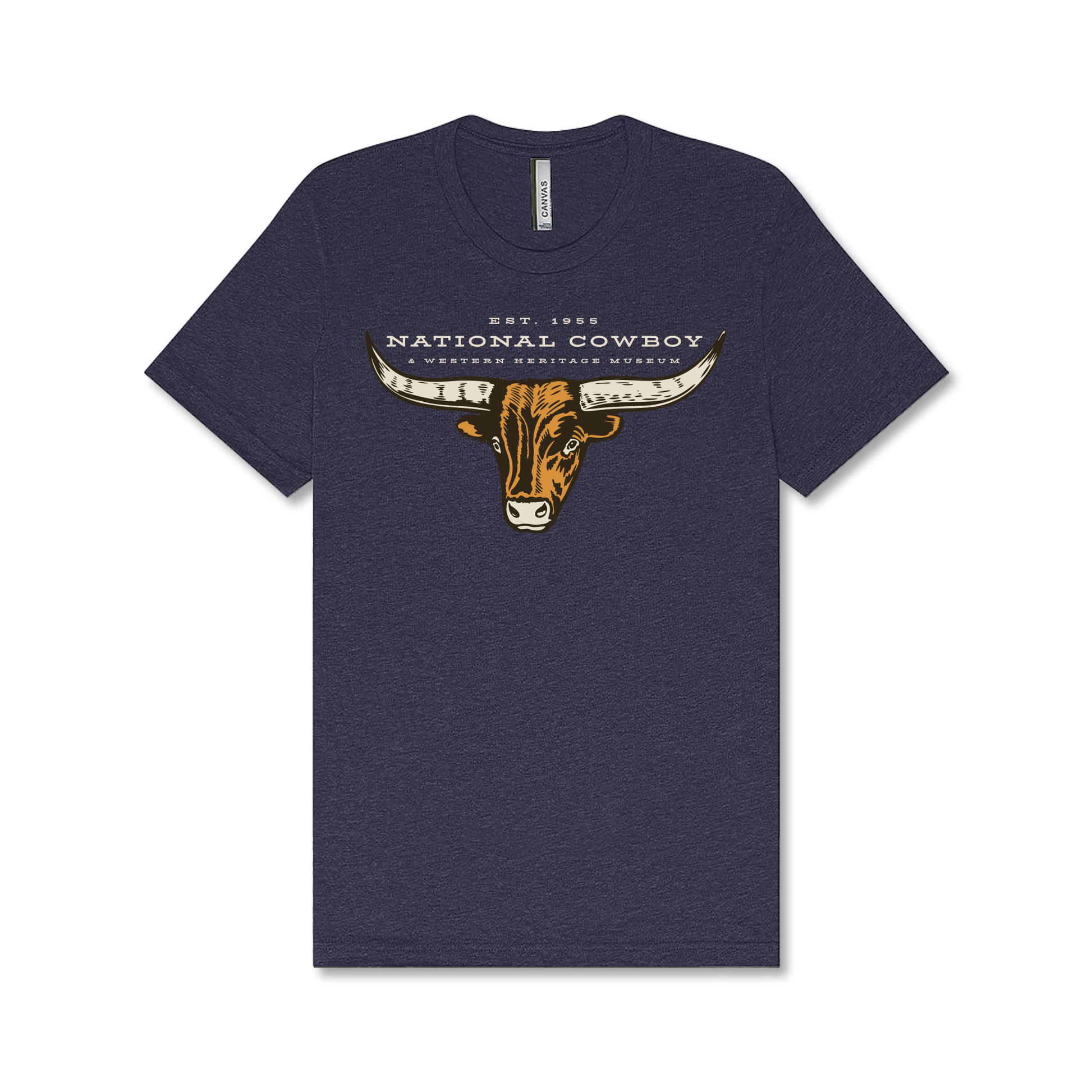Made of 100% soft cotton for an extra comfortable fit, this shirt comes in a beautiful midnight navy heather color and boasts an eye-catching longhorn steer graphic on the front.