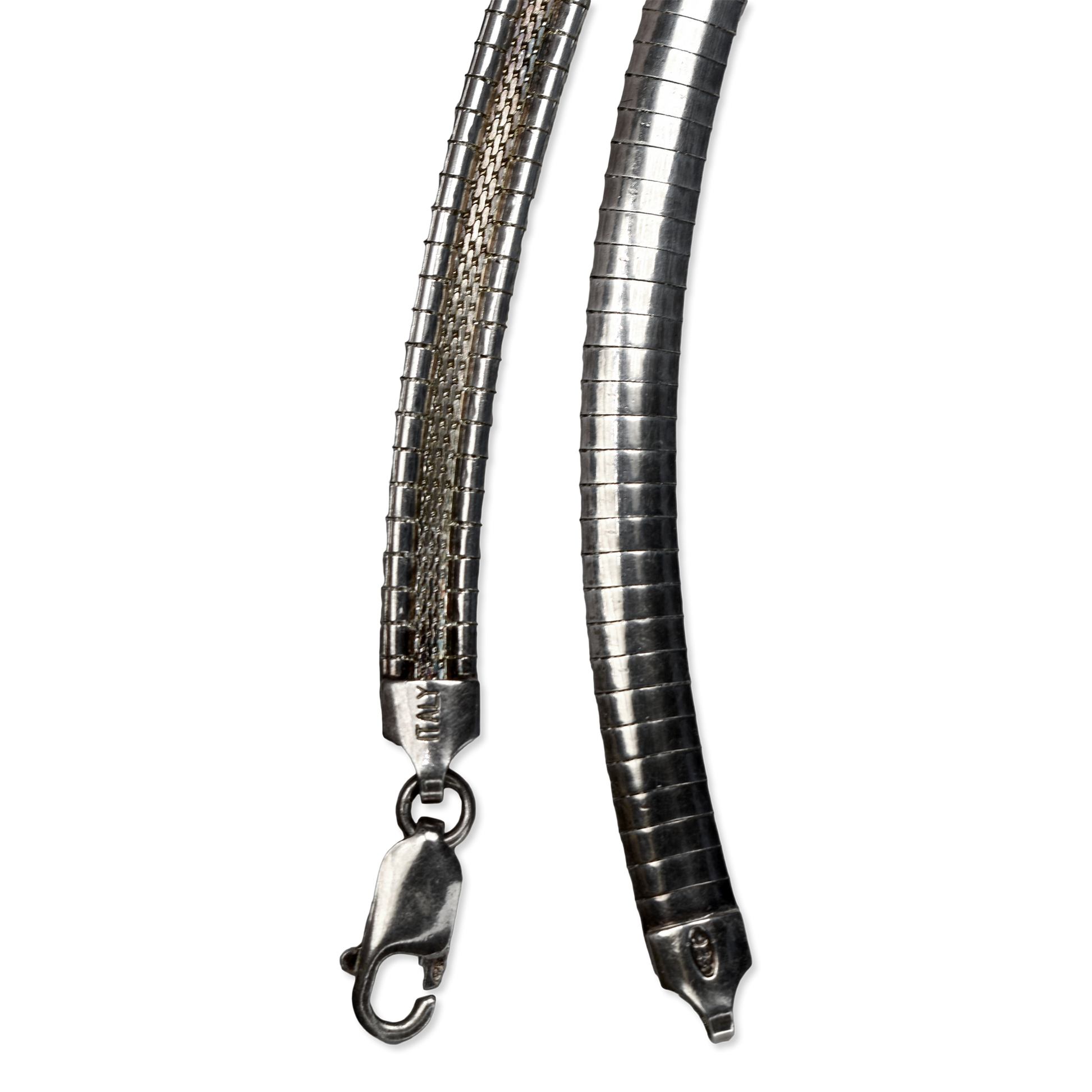 Its flat, flexible design offers a comfortable fit and a striking presence — perfect for elevating everyday wear or complementing evening attire. Finished with a secure lobster clasp, this necklace is a timeless blend of Italian craftsmanship and contemporary elegance.