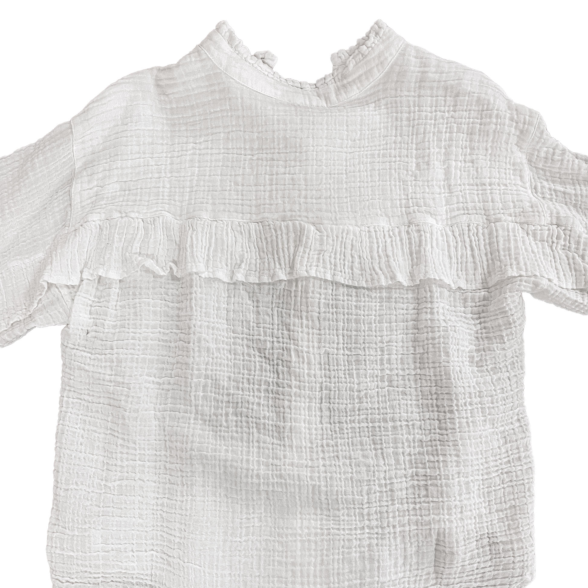 The Marina Blouse in crisp white embodies refined Western femininity with an easy, timeless feel. Its cotton gauze fabric feels soft and breathable, draping lightly yet with enough structure to flatter a variety of silhouettes — whether worn tucked into jeans or left loose and flowing.