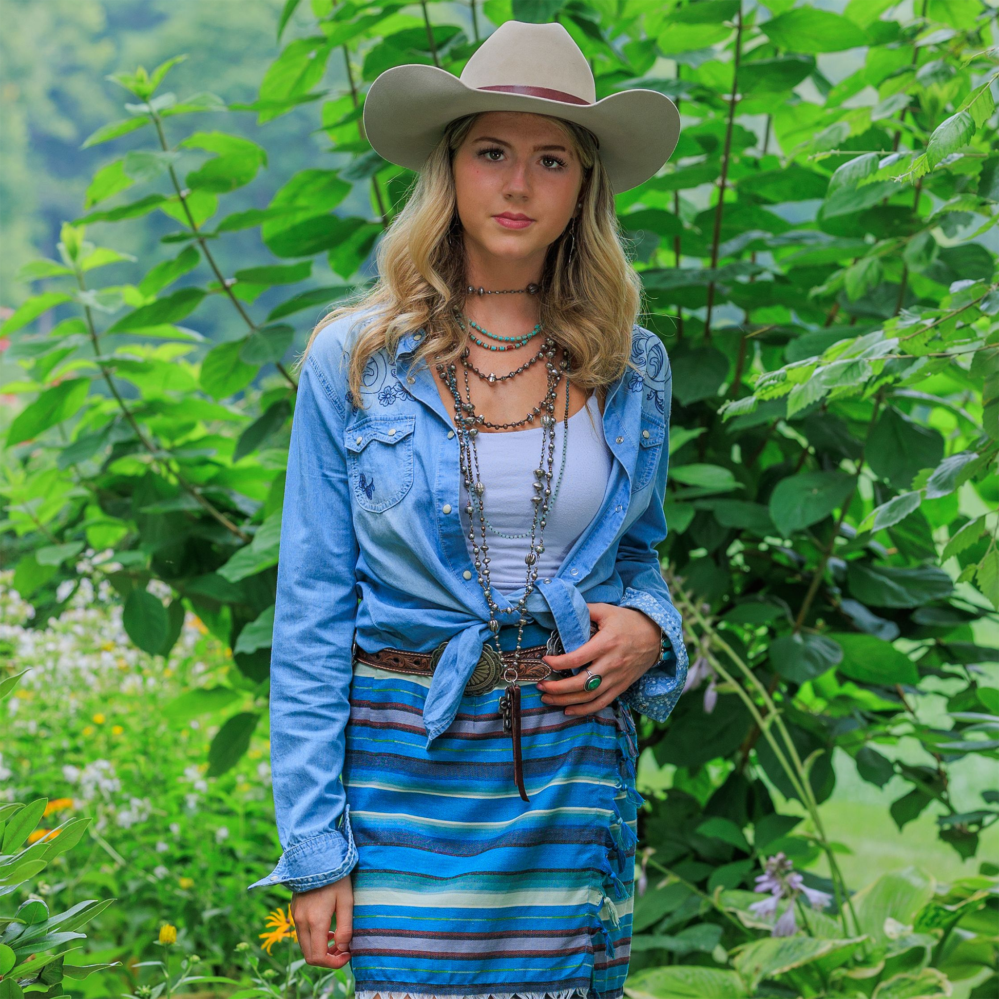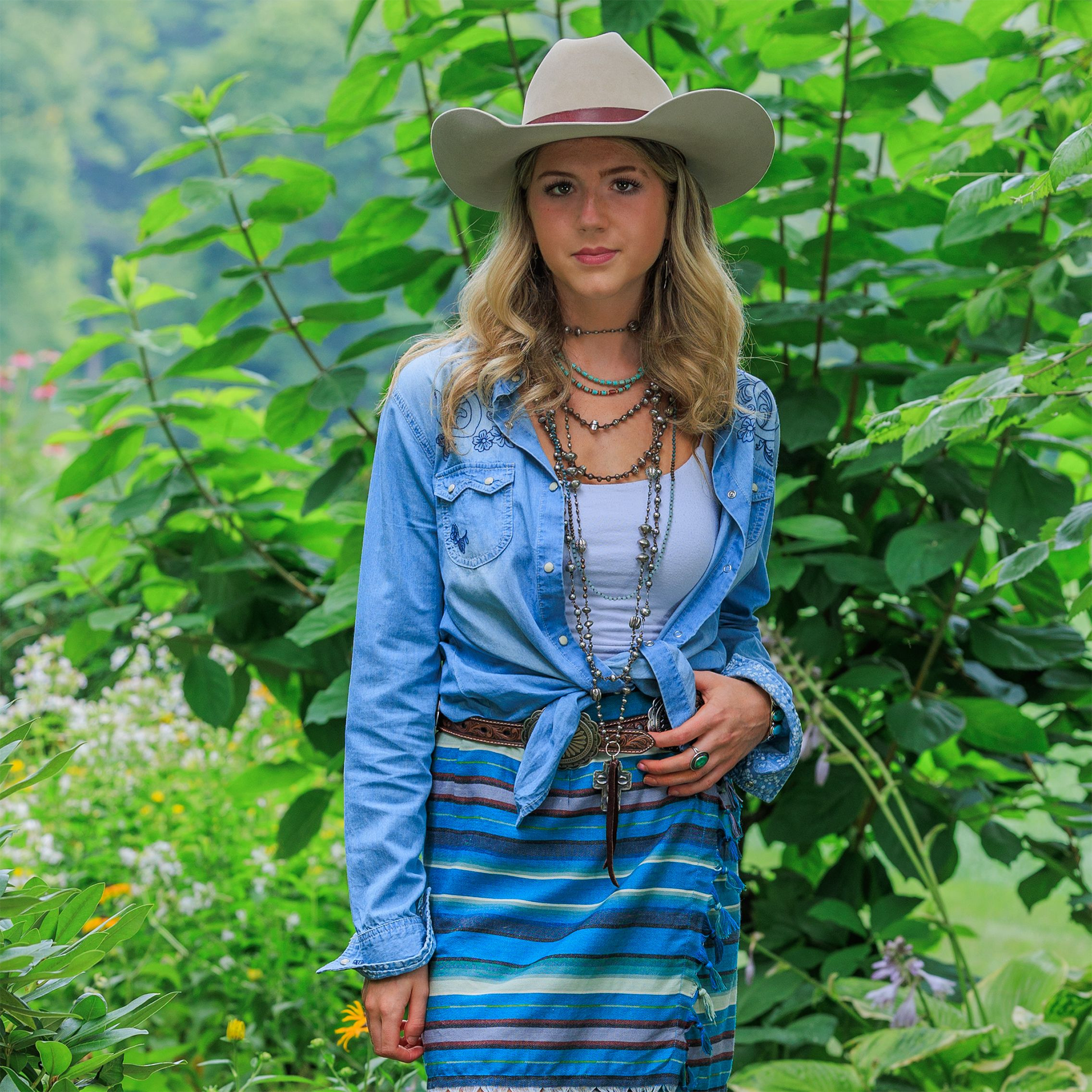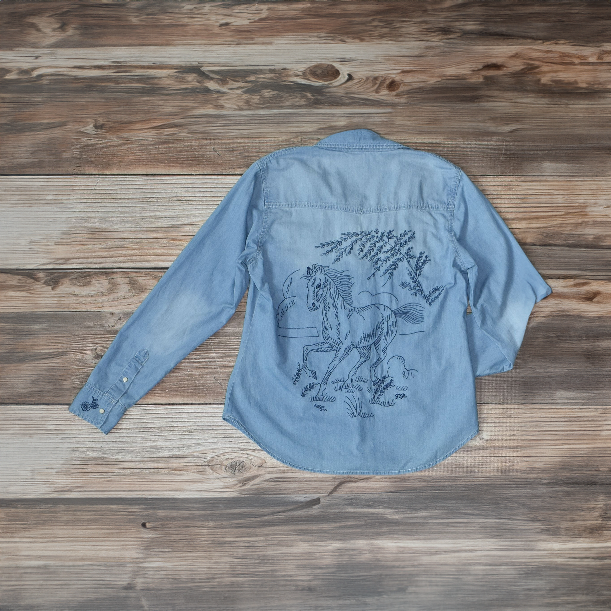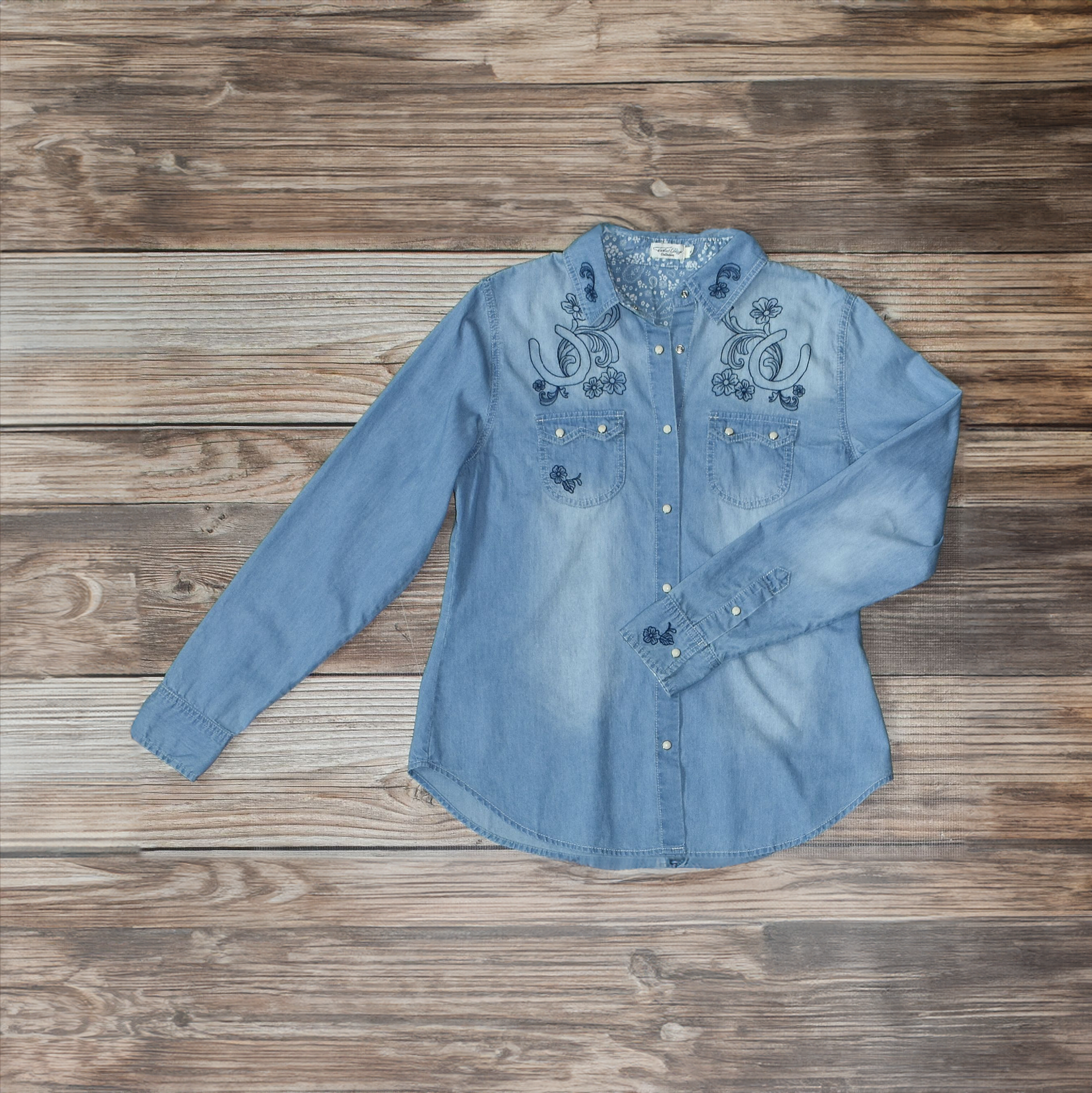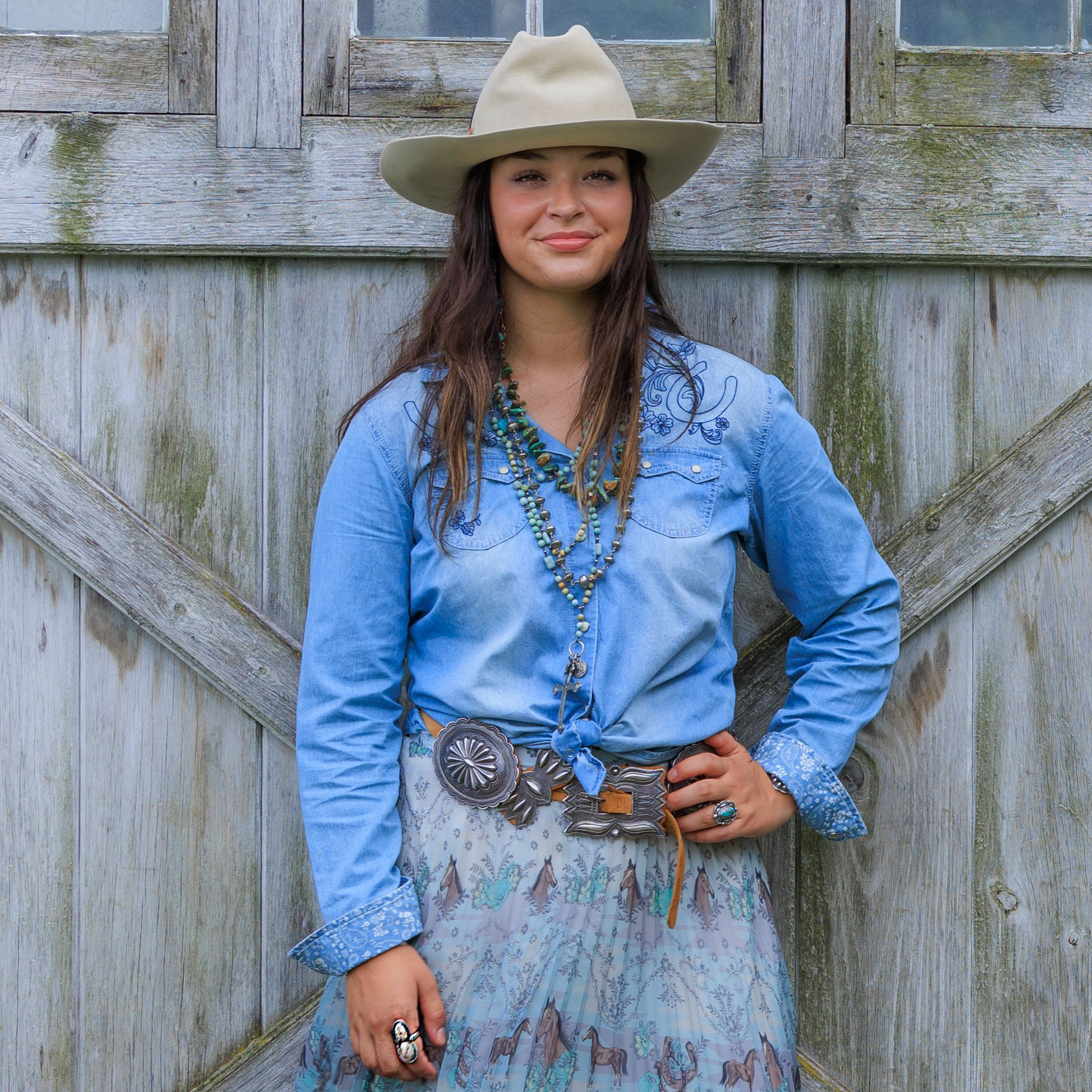 Introducing the Tasha Polizzi Button-Up Julianna Shirt in Washed Blue. Crafted from luxurious 100% cotton, this modern update on a cowgirl classic features delicate embroidered yoke and back detailing. With pearl snap buttons and long sleeves, this shirt exudes both sophistication and western charm.