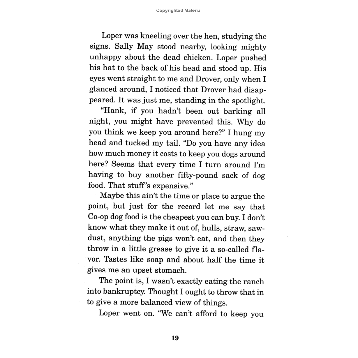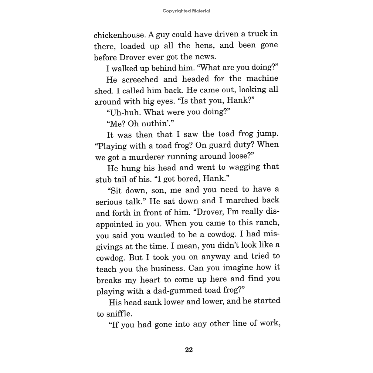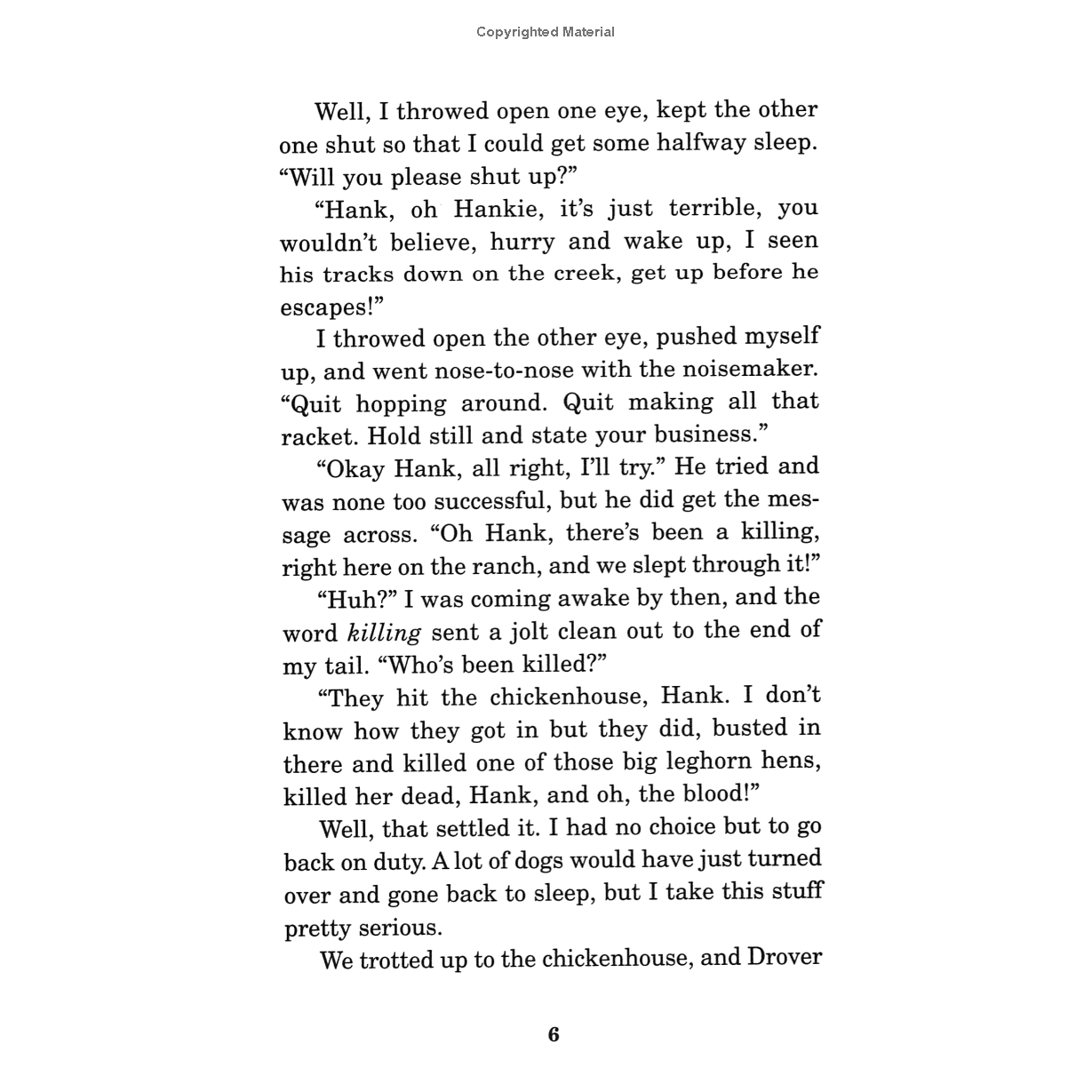 The popular Hank the Cowdog series is based on the humorous antics of the canine Head of Ranch Security. In this first book, Hank and his little buddy, Drover, set out to solve a series of baffling murders on the ranch. Is Hank a suspect? An Outlaw? Can he clear his good name?