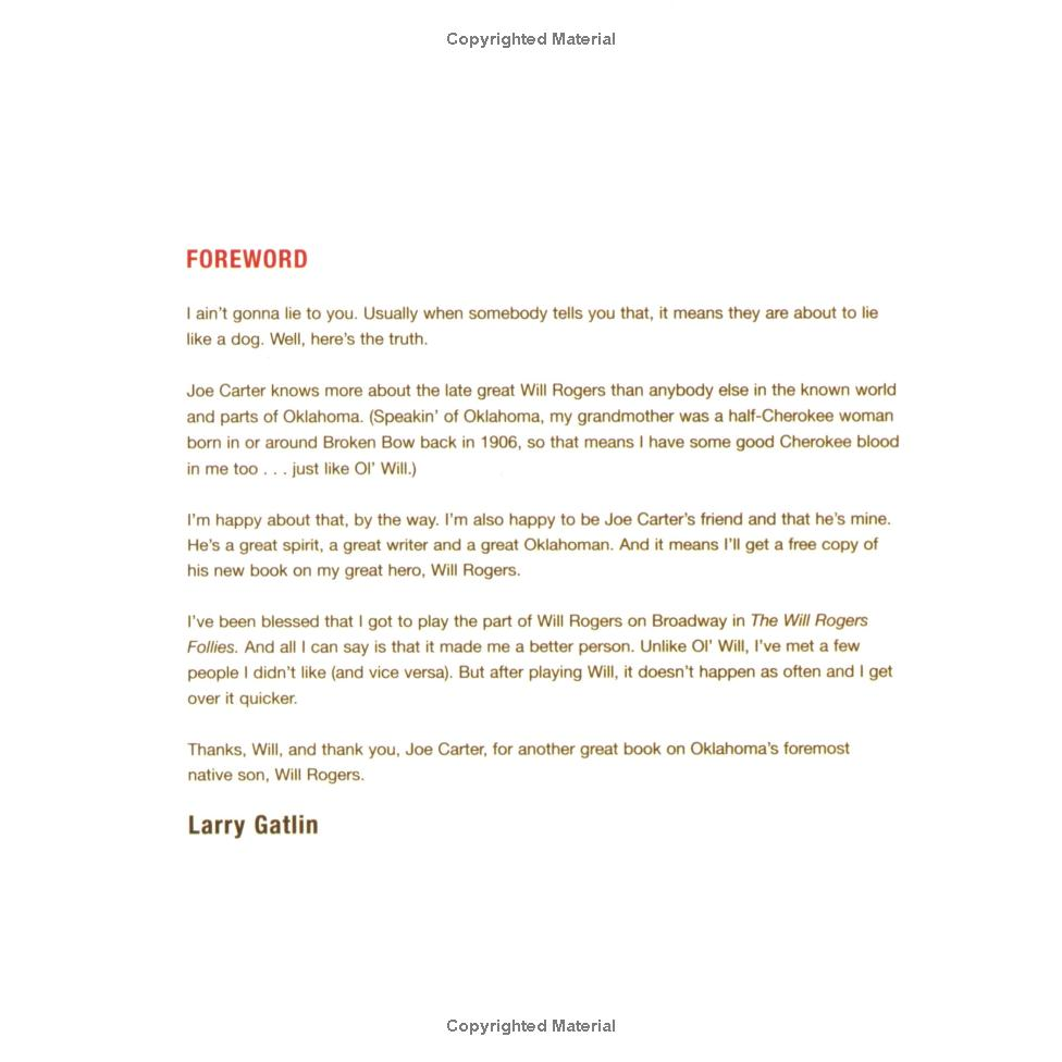 "'I ain't gonna to lie to you.'" Usually when somebody tells you that, it means they are about to lie like a dog. Well, here's the truth: Joe Carter knows more about the late great Will Rogers than anybody else in the known world and parts of Oklahoma." Larry Gatlin of the Gatlin Brothers, star of the touring production of The Will Rogers Follies: A Life in Revue.