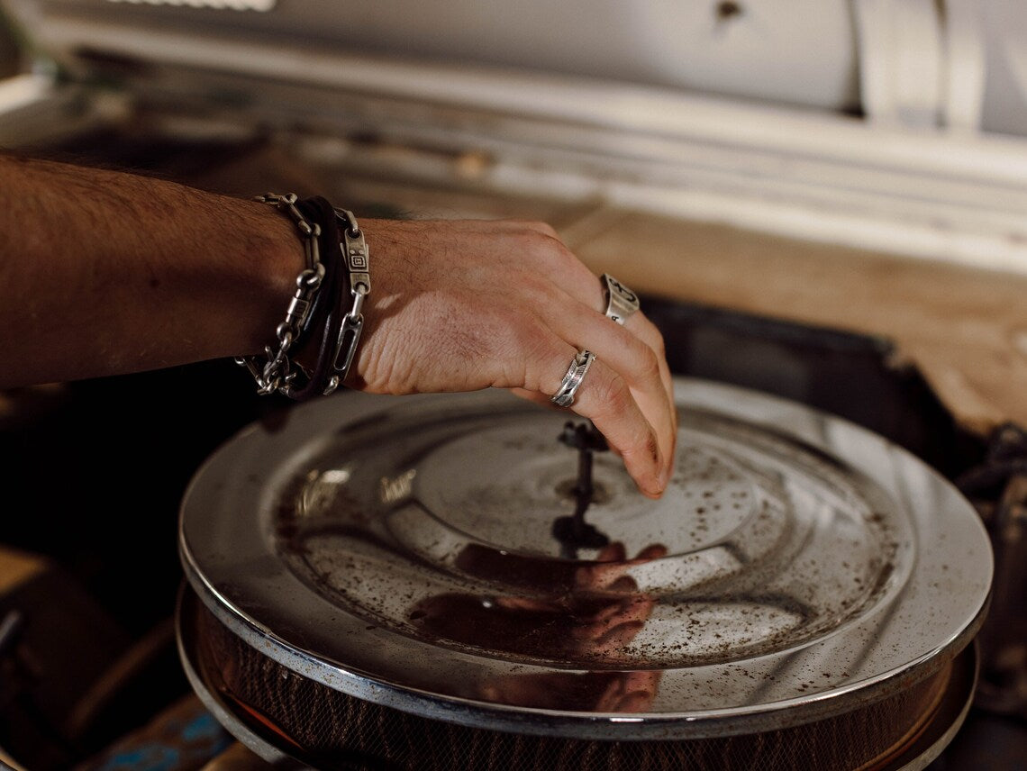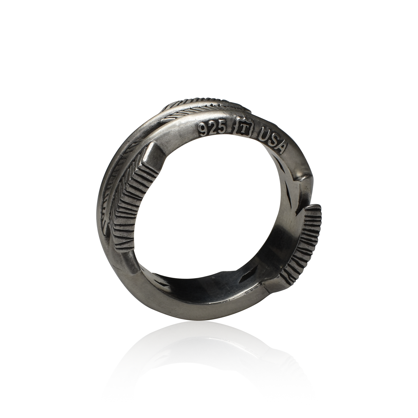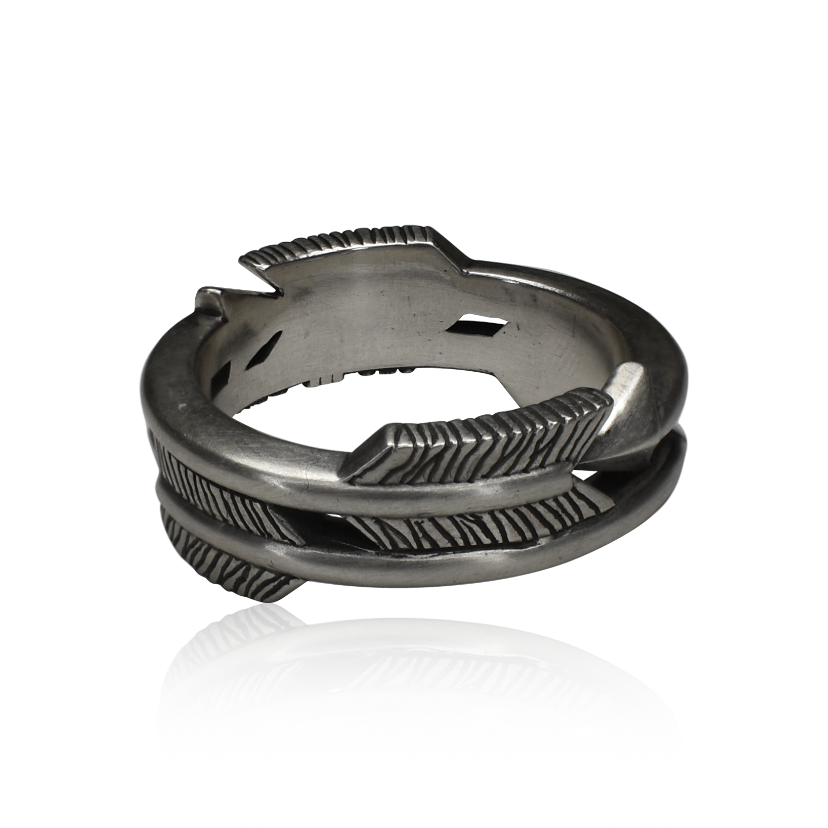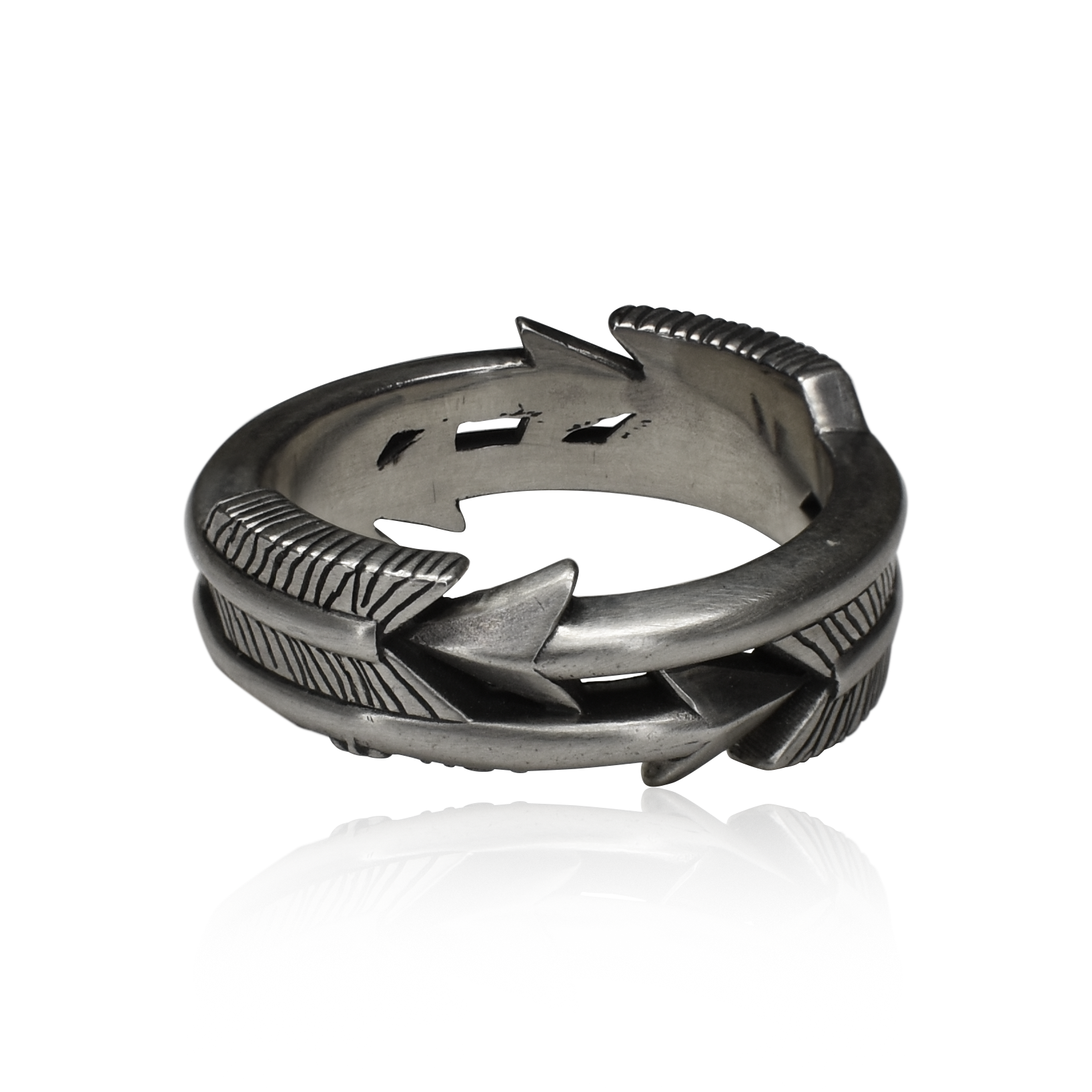 Bold, sculptural, and unmistakably Western, this Trove Jewelry Co. Arrows Ring brings together four interlocking arrows that wrap fluidly around the band. Each arrow is carved with hand-textured feathers, giving the piece a sense of movement and craftsmanship you can feel. Raised-letter markings add a rugged finishing touch, echoing the heritage of classic sterling work.