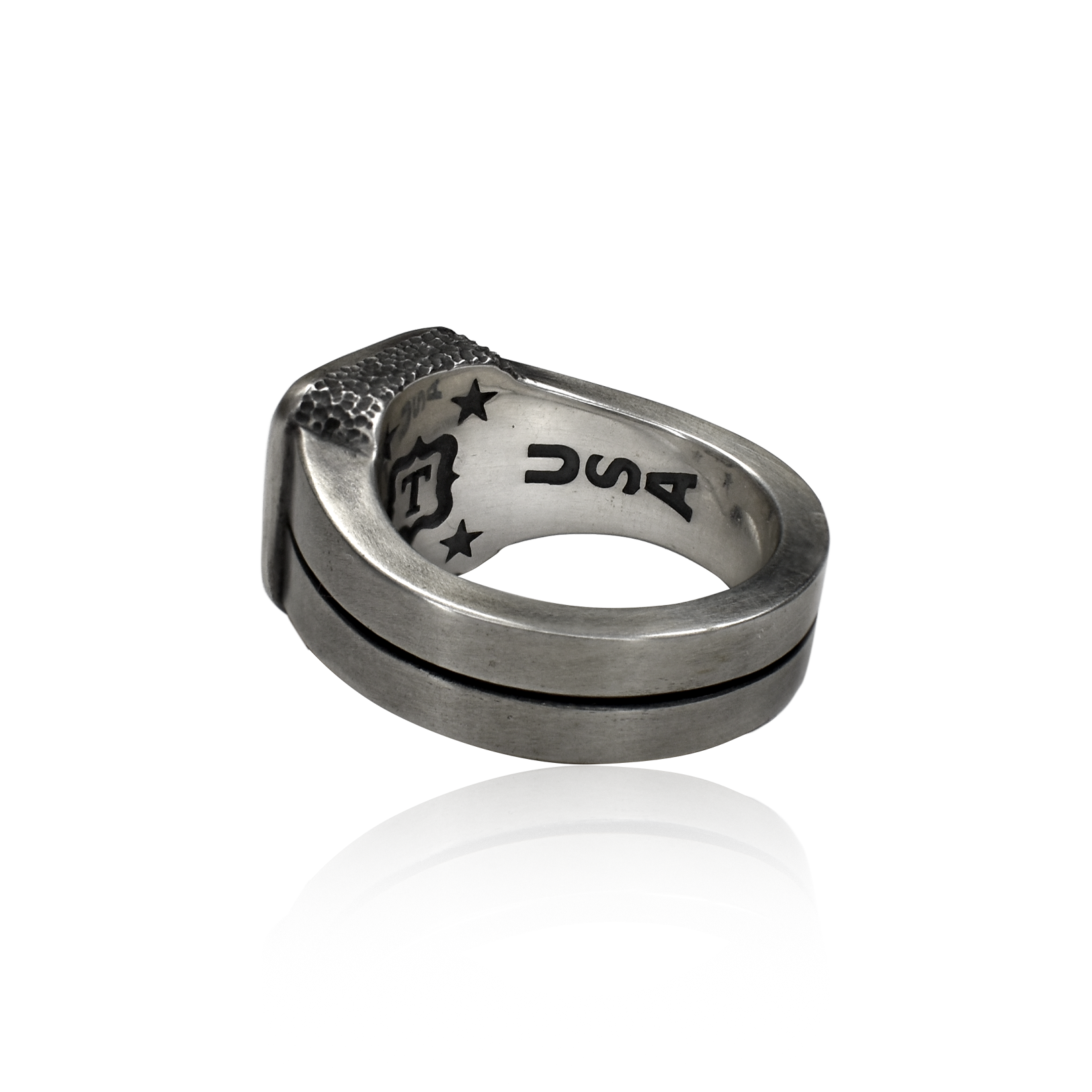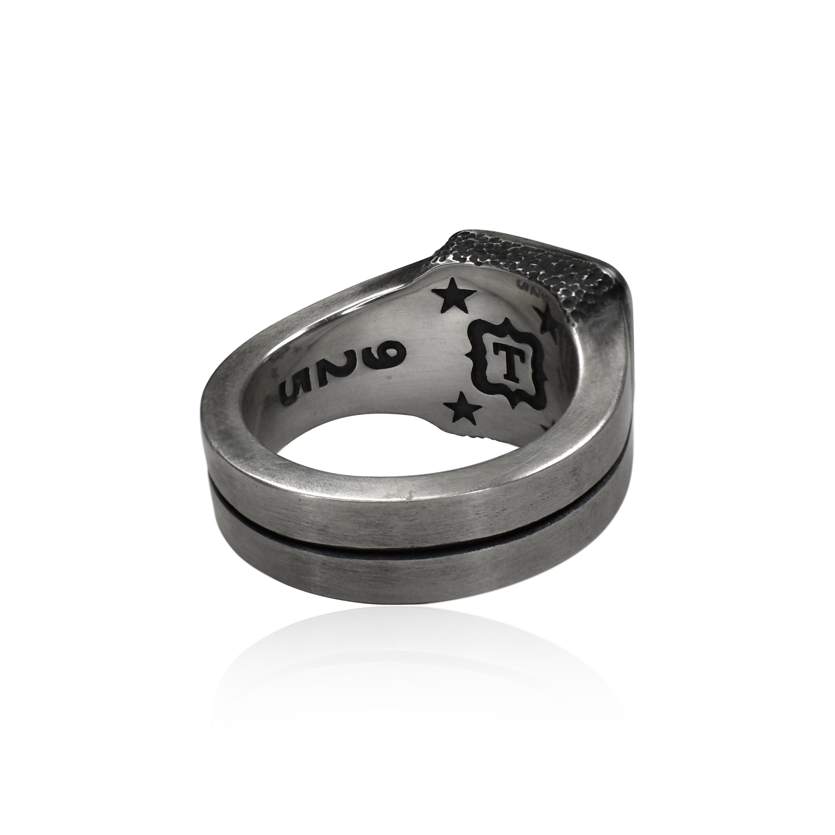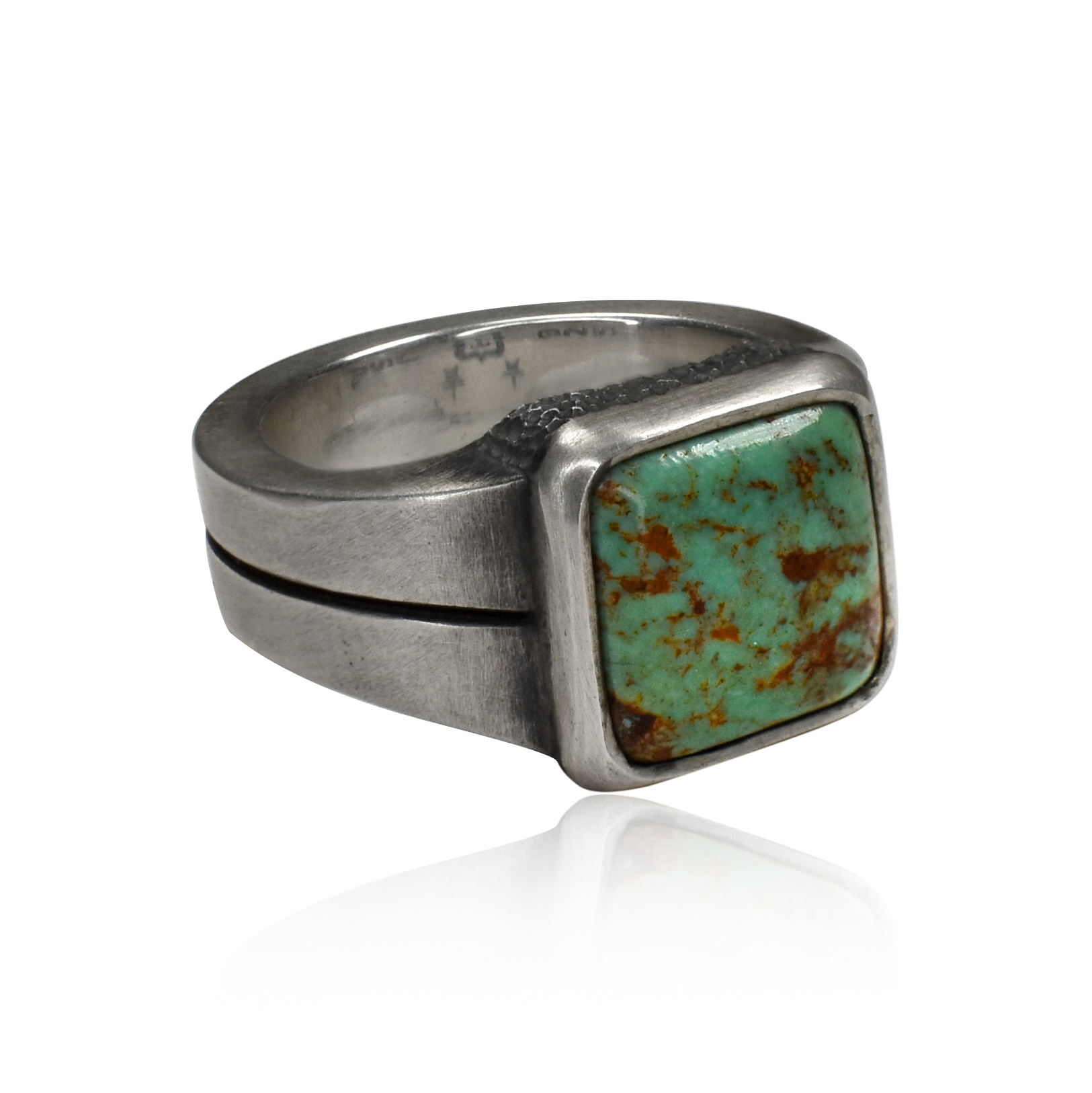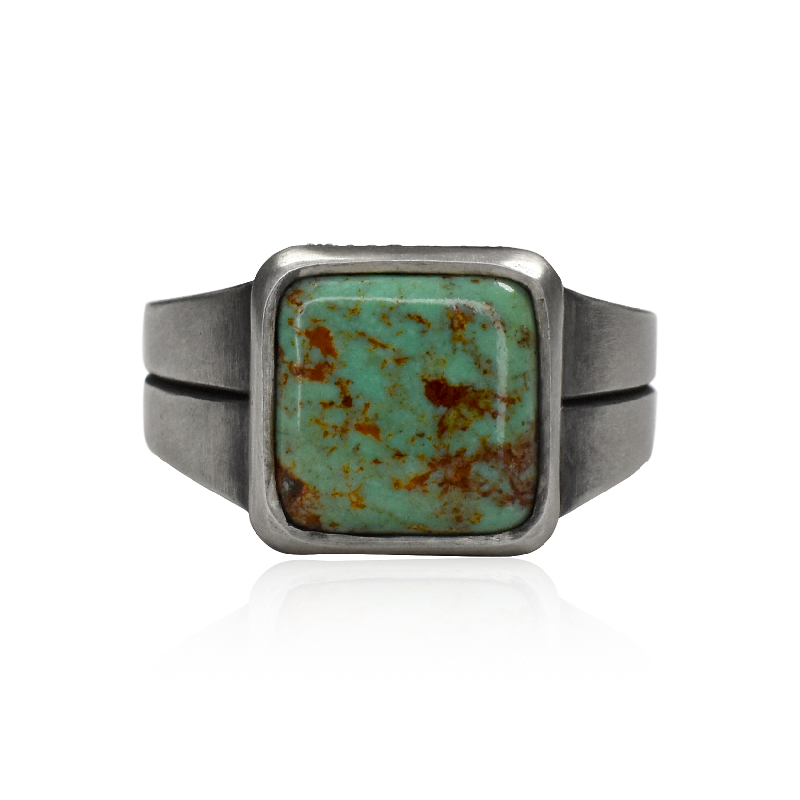 Bold, modern, and unmistakably Western, this handcrafted ring from Trove Jewelry Co. brings together clean geometric lines and the timeless character of natural turquoise. Designed with a distinctive tobacco pipe silhouette, the wide band is split along the middle, giving the piece a strong architectural feel while keeping it comfortable for everyday wear. The brushed sterling silver has a rugged, matte finish that complements the stone without distracting from it.
