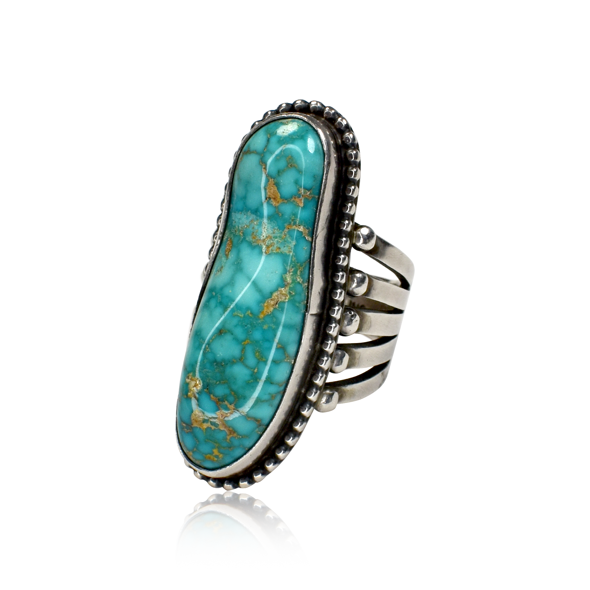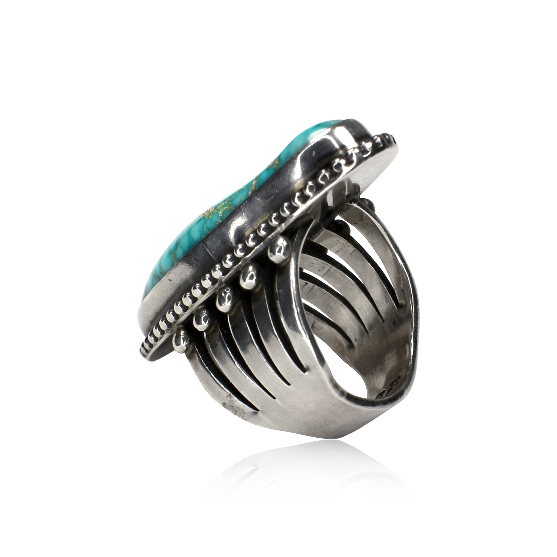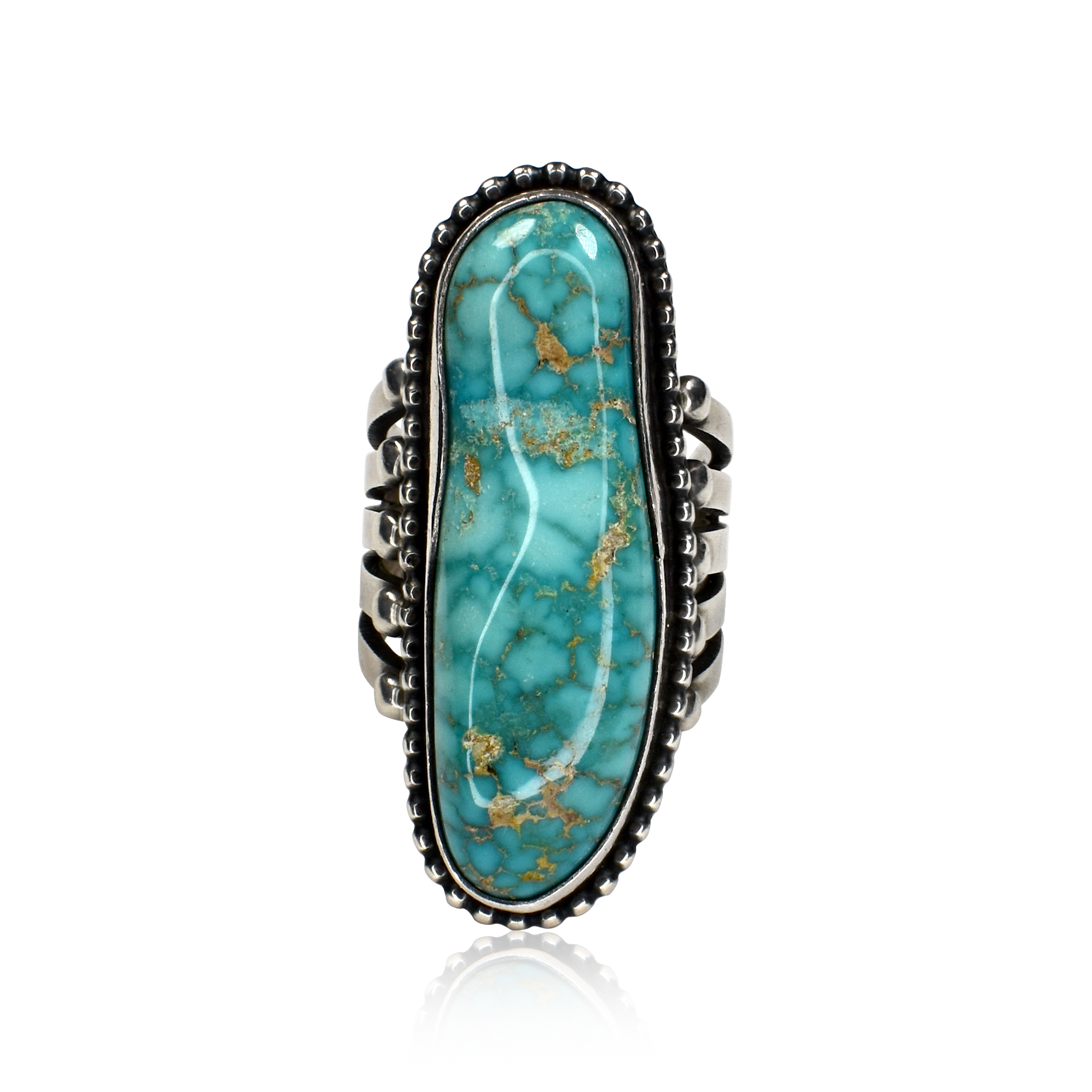 This striking handcrafted ring by Navajo silversmith Verdy Jake features a long oval Turquoise Mountain turquoise set in a smooth bezel with a beaded sterling silver border. The split shank design balances the bold turquoise cabochon with elegant silverwork, creating a distinctive Southwestern statement piece.