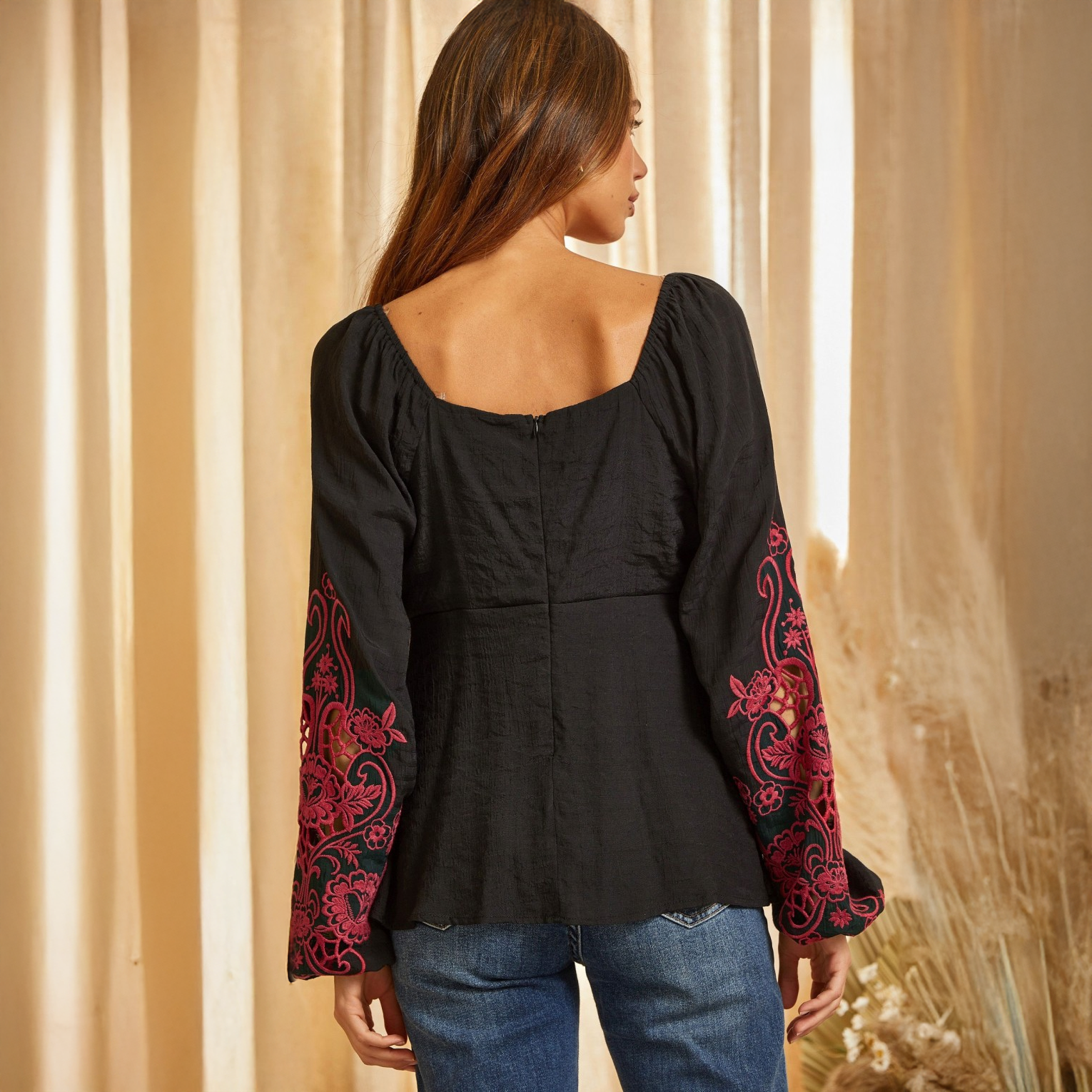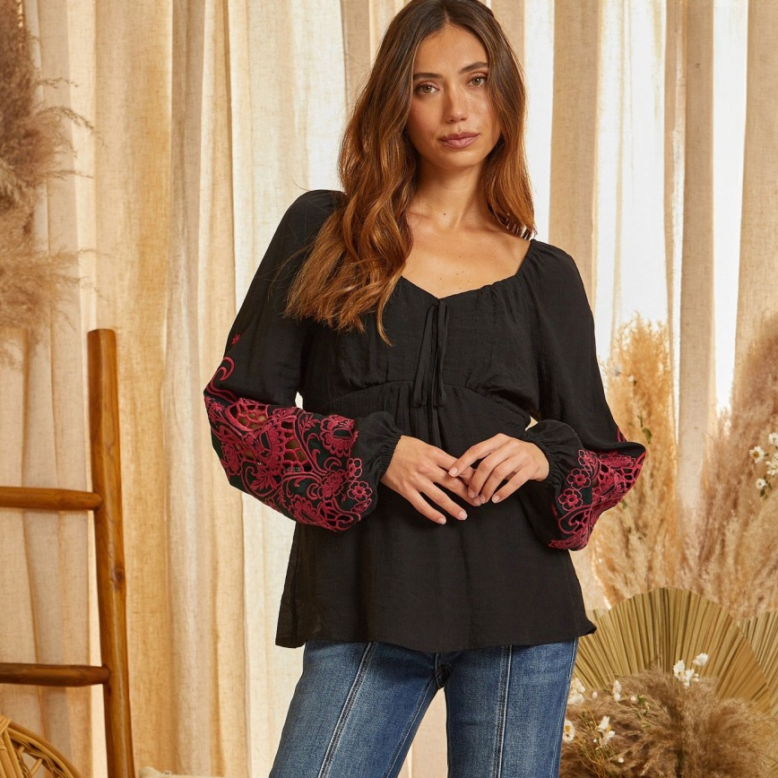 Where elegance meets the edge of the Western dusk, the Night Rose Top brings together bold embroidery and soft femininity. This black peplum blouse features rich rose-toned stitching, a flowing babydoll waistline, and long sleeves for a silhouette that flatters and moves. The V-neckline adds a hint of romance, perfect for day-to-night styling.
