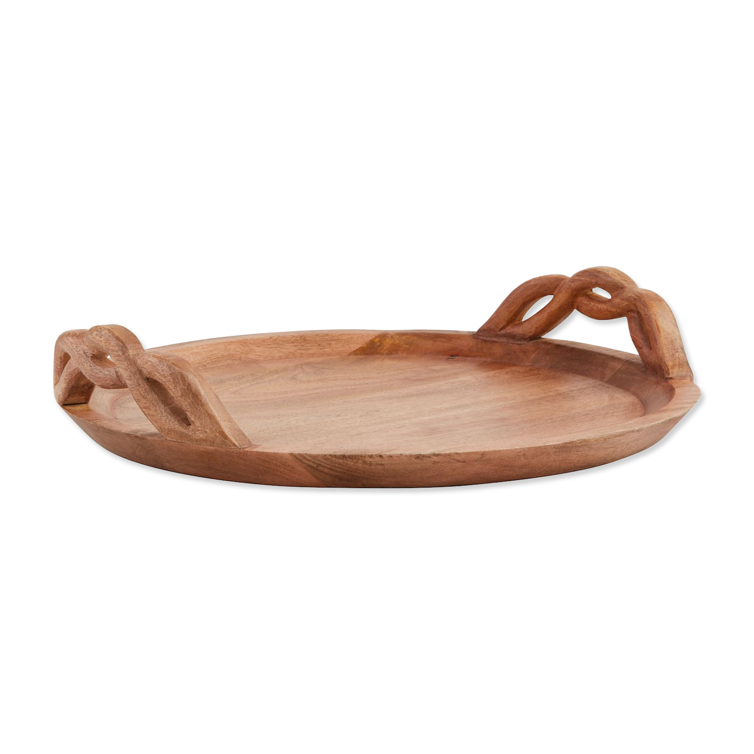 From Mud Pie, this round tray features a stunning design with dimensional twisted handles that add a touch of elegance and uniqueness.