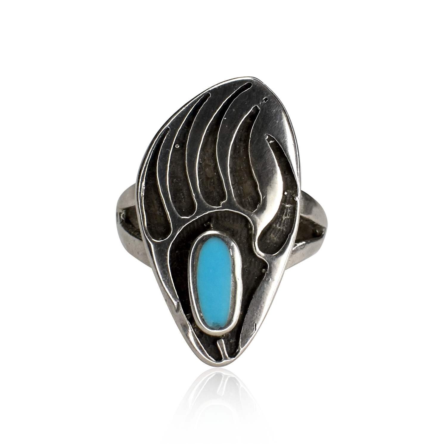 A classic symbol of strength and protection, this vintage sterling silver ring features a hand-carved bear claw motif centered with an oval Sleeping Beauty turquoise cabochon. The asymmetrical design gives it a distinctive, organic character; the turquoise set like the heart of the paw, radiating soft blue color against the textured silver.