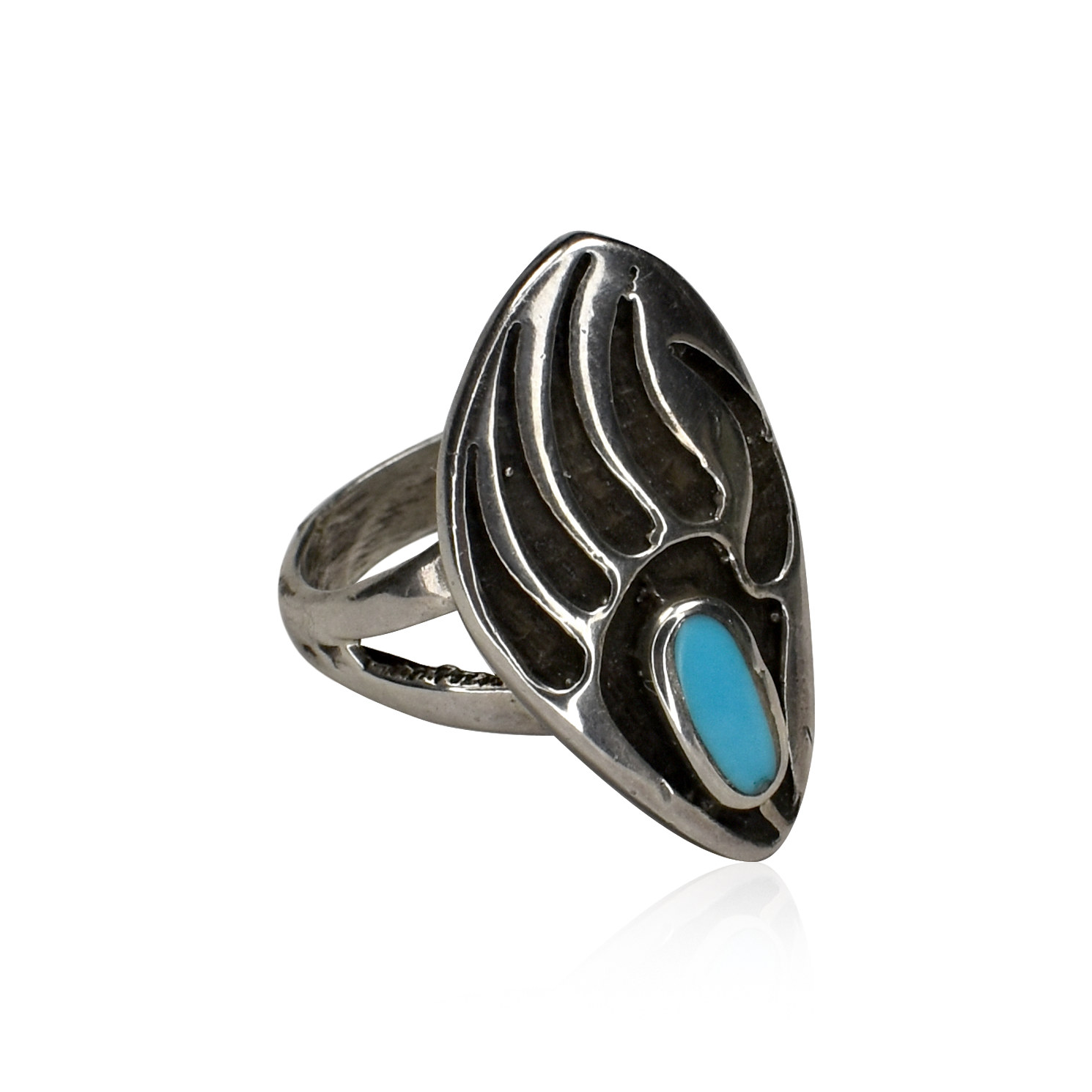 Dating to the 1960s, this piece reflects the era’s embrace of bold Native-inspired motifs in wearable art. The bear claw has long been associated with courage, healing, and spiritual power, while Sleeping Beauty turquoise, prized for its serene sky-blue tone, adds balance and calm. A split double-prong shank completes the design with sculptural grace and comfort.