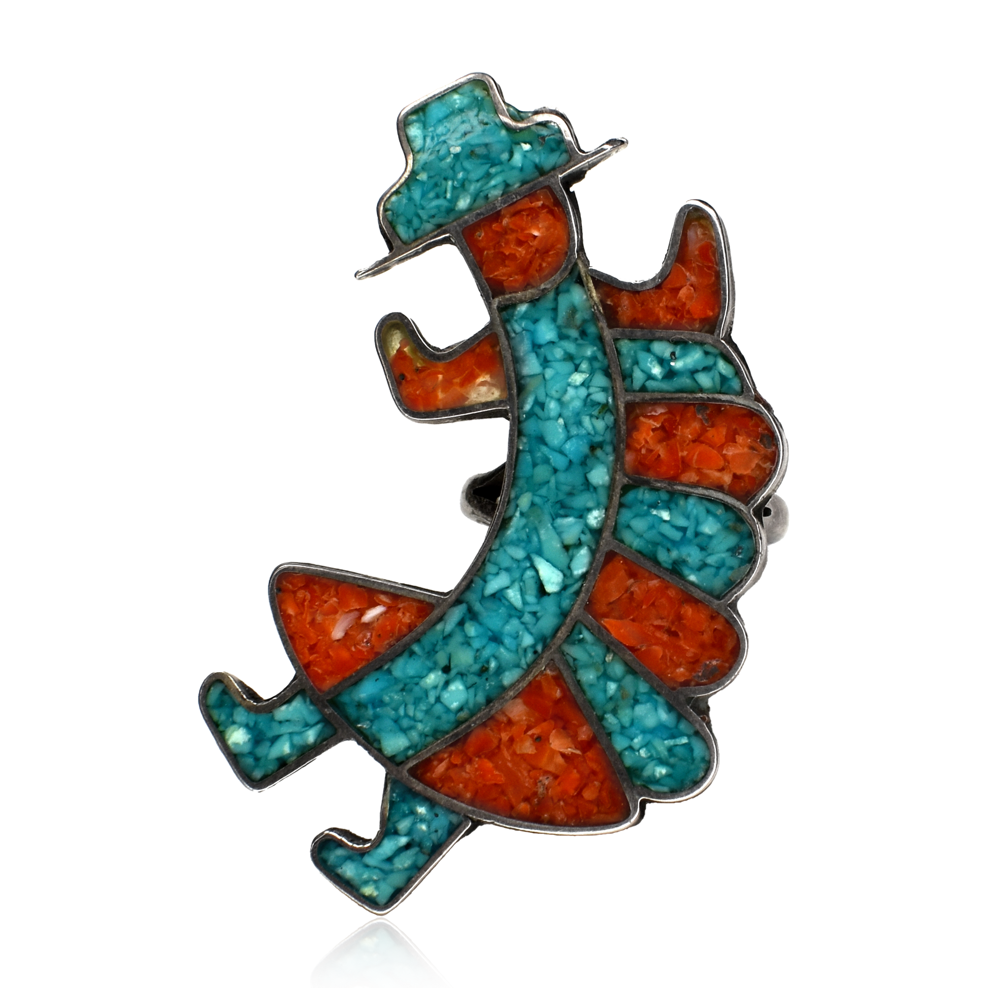 Chip inlay jewelry, popularized in the mid-20th century by Navajo and Zuni artisans, is an intricate technique where crushed stone is set into channels of silver and polished smooth. This piece carries that legacy beautifully, blending precision silversmithing with a playful, expressive design that captures the spirit of the kachina: a symbol of life, harmony, and transformation in Pueblo and Hopi cultures.