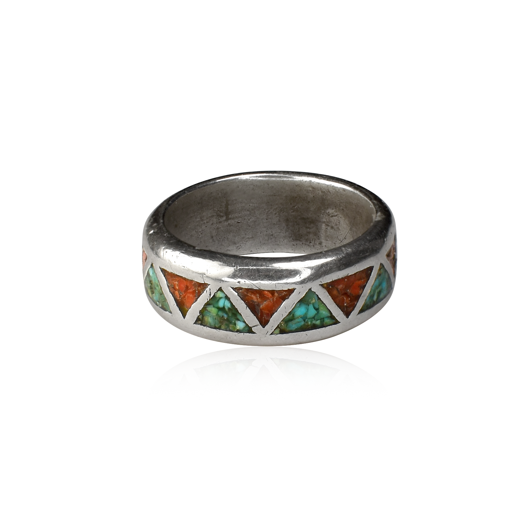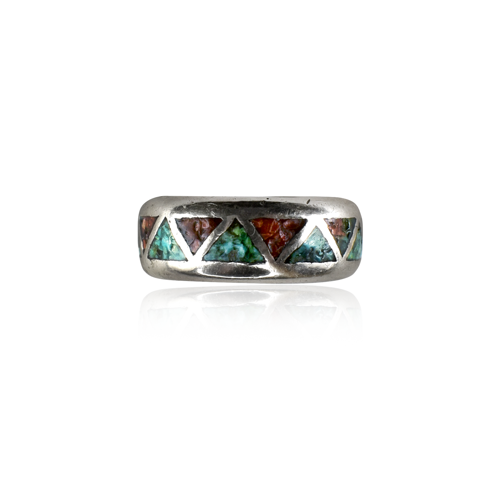 Measuring 5/16" wide and 7/8" across, this size 8 ring has a sleek, low-profile silhouette that’s smooth to the touch and comfortable for everyday wear. The triangular layout of the inlay gives the ring a flame-like energy, making it a standout piece that blends vintage craftsmanship with timeless symbolism. Whether worn as a statement or collected for its artistry, this ring carries the spirit of tradition in a modern form.
