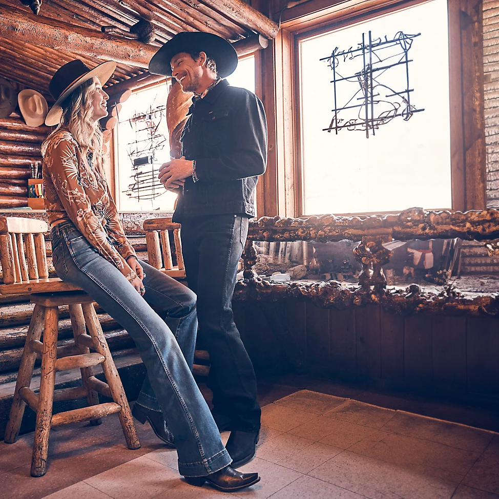 Your favorite Retro® jeans just got even better. Wrangler's Retro® Bailey High Rise Bootcut Jean delivers unmatched style, fit, and quality. An ultra-flattering high rise and classic five-pocket styling are enhanced with denim specifically crafted to have superior stretch recovery, meaning they will hold their shape throughout the day without bagging or sagging. A slim fit through the seat and thighs opens to a wide trouser leg at the knee, a silhouette that looks as great in the saddle as it does in the city streets. And to ensure their authenticity, each pair is finished with Wrangler's seven icons: flat copper rivets, a rope logo shank, a leather back pocket patch, 'W' pocket stitching, seven belt loops with reinforced tacking, a rodeo watch pocket, and a back yoke over body.