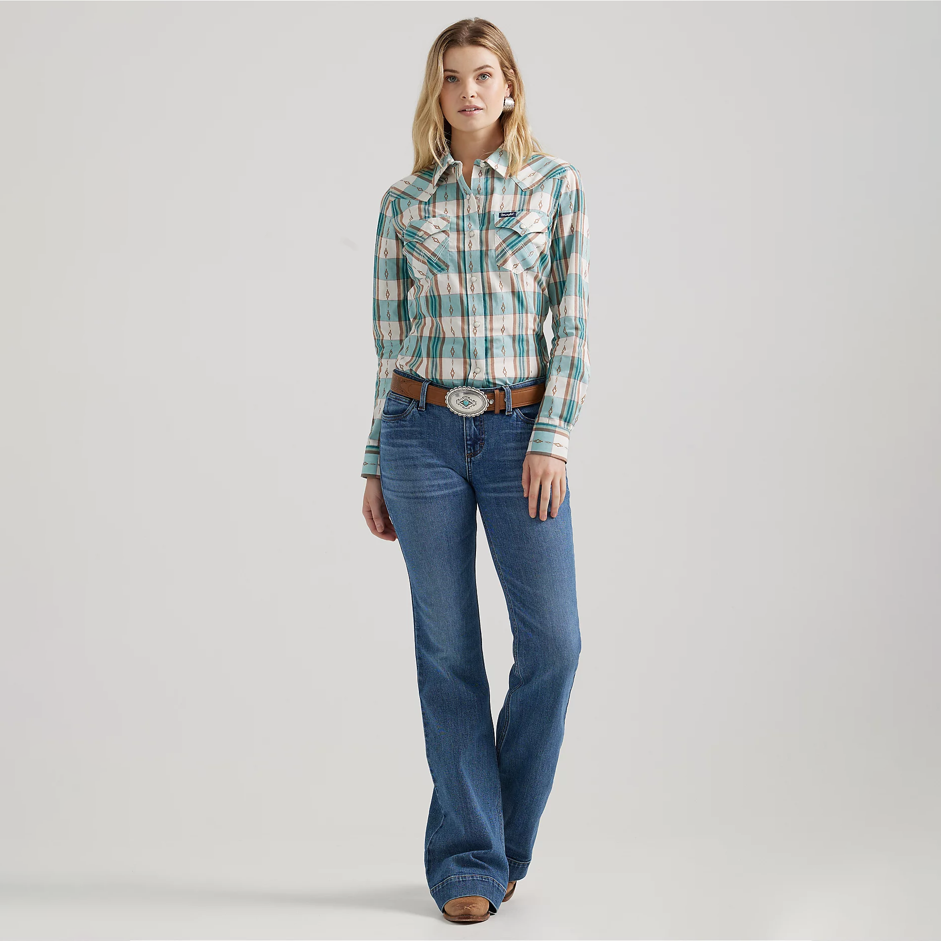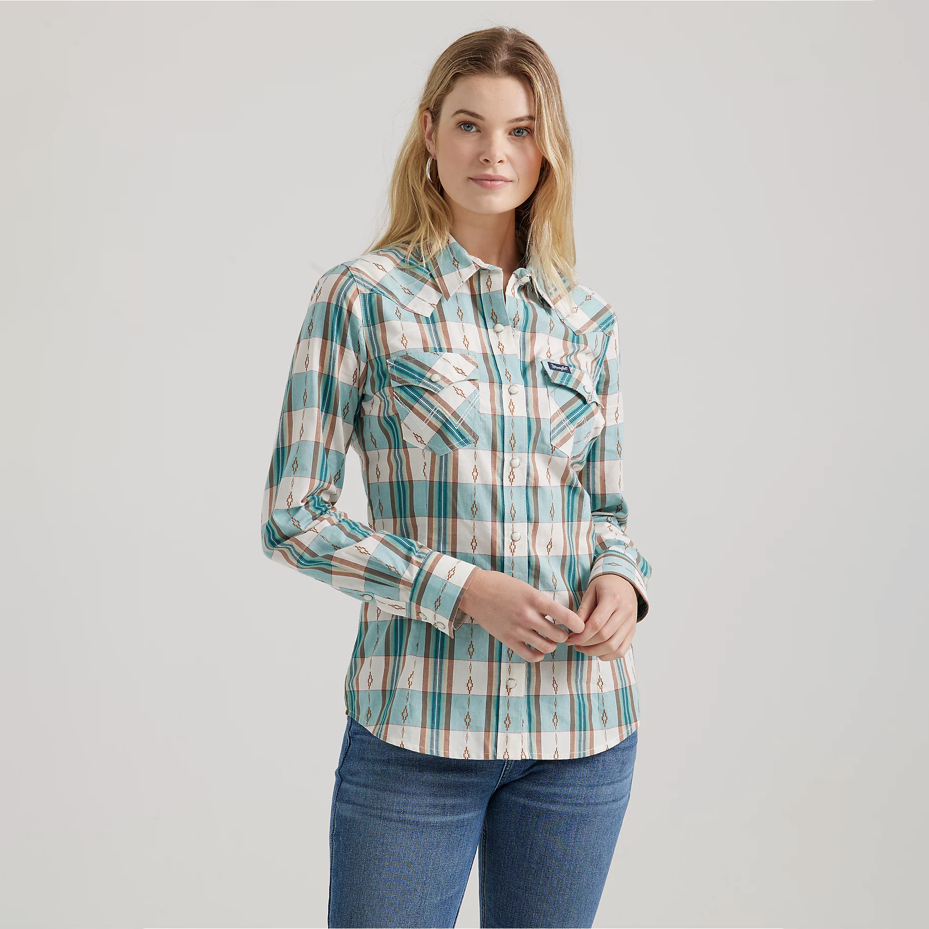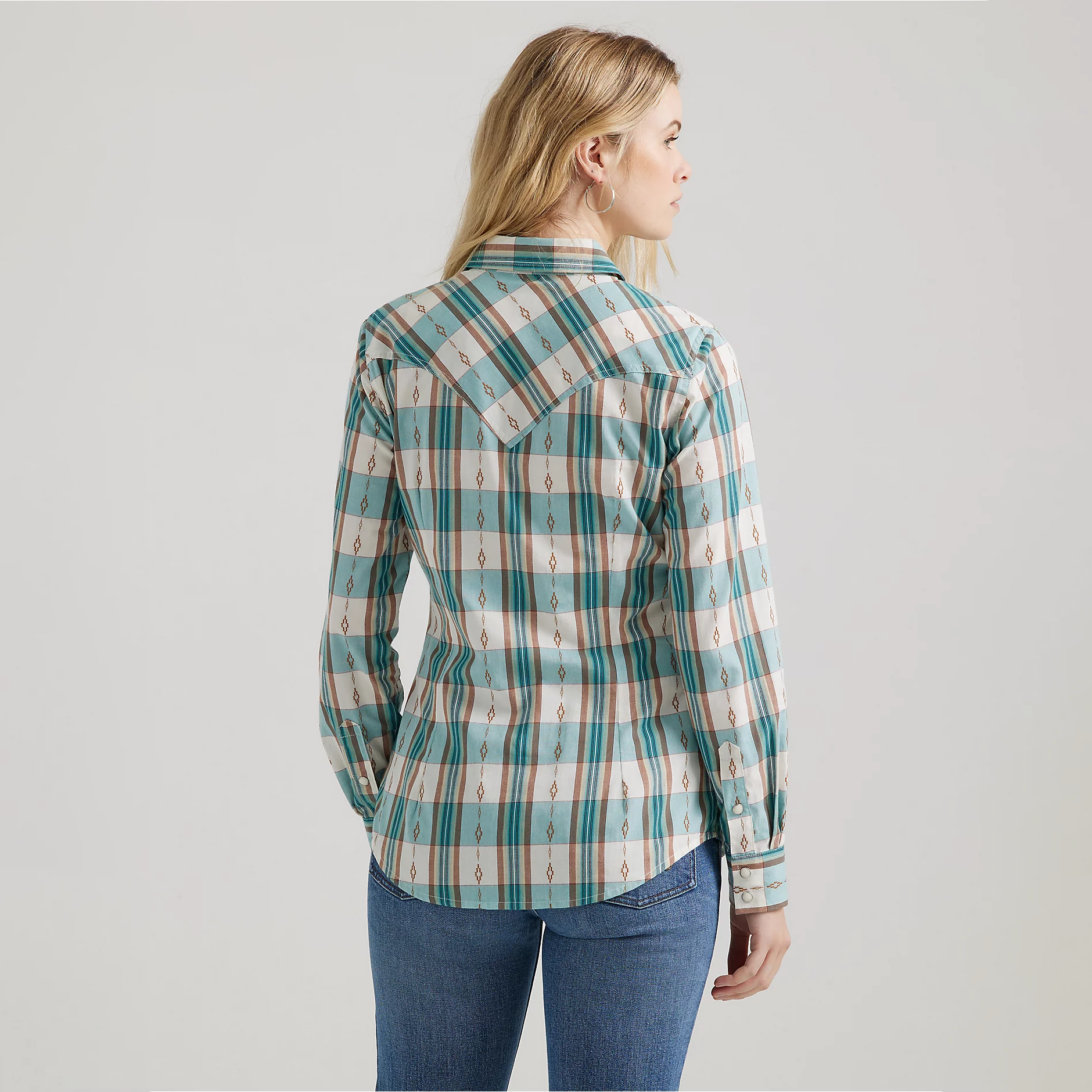 Wrangler Women's Plaid Slim Western Snap Shirt - Sky Blue