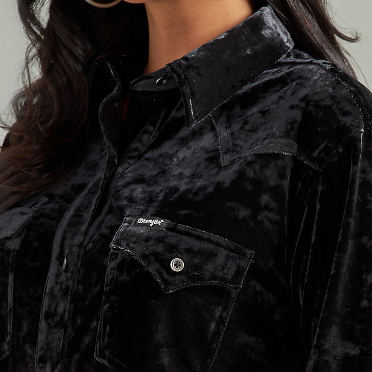 This boyfriend fit, long-sleeve velvet shirt features a Western one-point yoke on the front, straight back yoke with pleat, and two chest pockets. The understated silhouette's velvet fabric gives it a striking look while its boyfriend fit offers all-day comfort you'll love. Add your favorite Western accessories and Wrangler denim for an outfit that keeps you ahead of the latest trends.